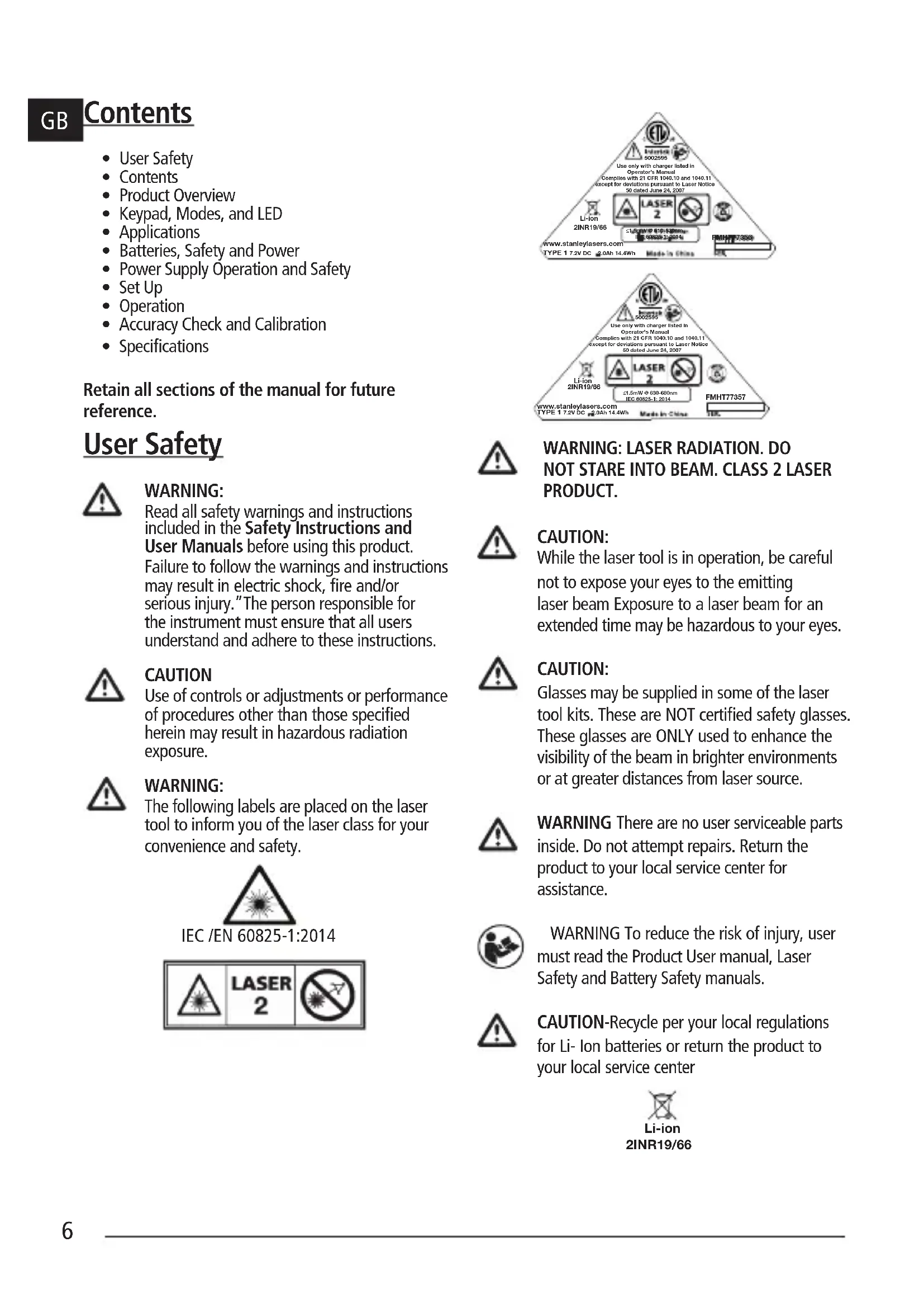 www.stanleylasers.com Complies with 21 CFR 1040.10 and 1040.11 except for deviations pursuant to Laser Notice 50 dated June 24, 2007 TYPE 1 7.2V DC 2.0Ah 14.4Wh FMHT77356 ≤1.5mW @ 510-530nm IEC 60825-1: 2014 Use only with charger listed in Operator’s Manual 2INR19/66 Li-ion www.stanleylasers.com Complies with 21 CFR 1040.10 and 1040.11 except for deviations pursuant to Laser Notice 50 dated June 24, 2007