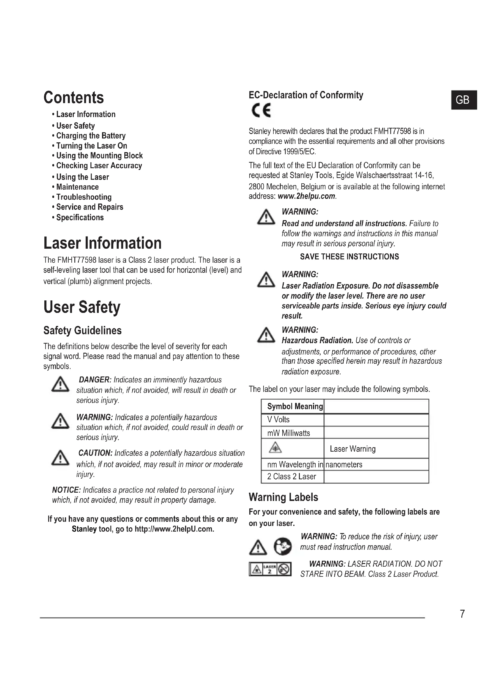 situation which, if not avoided, could result in death or serious injury. CAUTION: Indicates a potentially hazardous situation which, if not avoided, may result in minor or moderate injury. NOTICE: Indicates a practice not related to personal injury which, if not avoided, may result in property damage. If you have any questions or comments about this or any Stanley tool, go to http://www.2helpU.com. EC-Declaration of Conformity Stanley herewith declares that the product FMHT77598 is in compliance with the essential requirements and all other provisions of Directive 1999/5/EC. The full text of the EU Declaration of Conformity can be requested at Stanley Tools, Egide Walschaertsstraat 14-16, 2800 Mechelen, Belgium or is available at the following internet address: www.2helpu.com.
