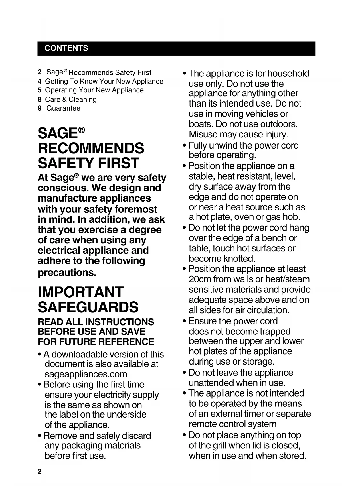 - Do not place anything on top of the grill when lid is closed, when in use and when stored. 2 Sage Recommends Safety First4 Getting To Know Your New Appliance5 Operating Your New Appliance8 Care & Cleaning9 Guarantee3