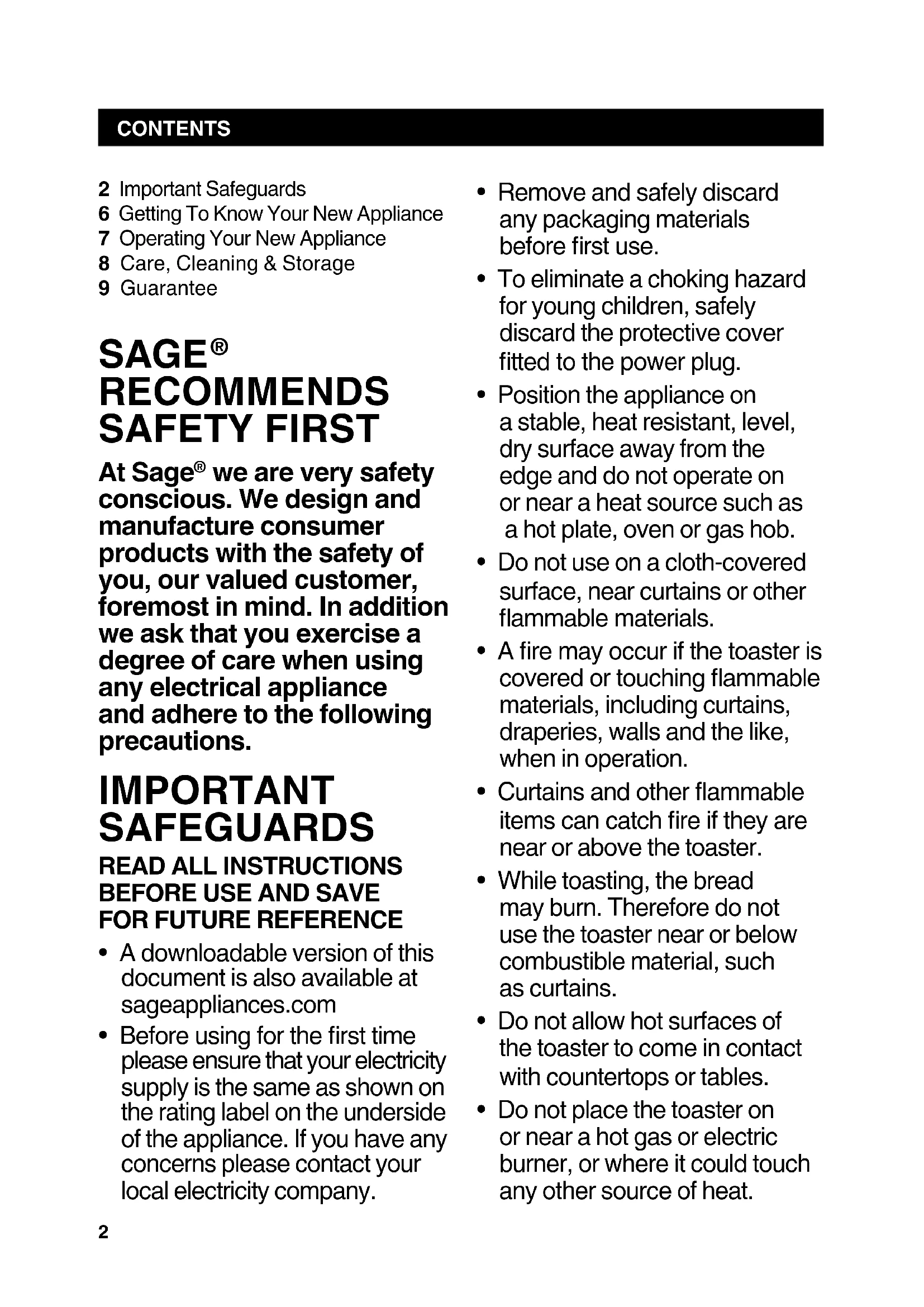 At Sage® we are very safety conscious. We design and manufacture consumer products with the safety of you, our valued customer, foremost in mind. In addition we ask that you exercise a degree of care when using any electrical appliance and adhere to the following precautions.