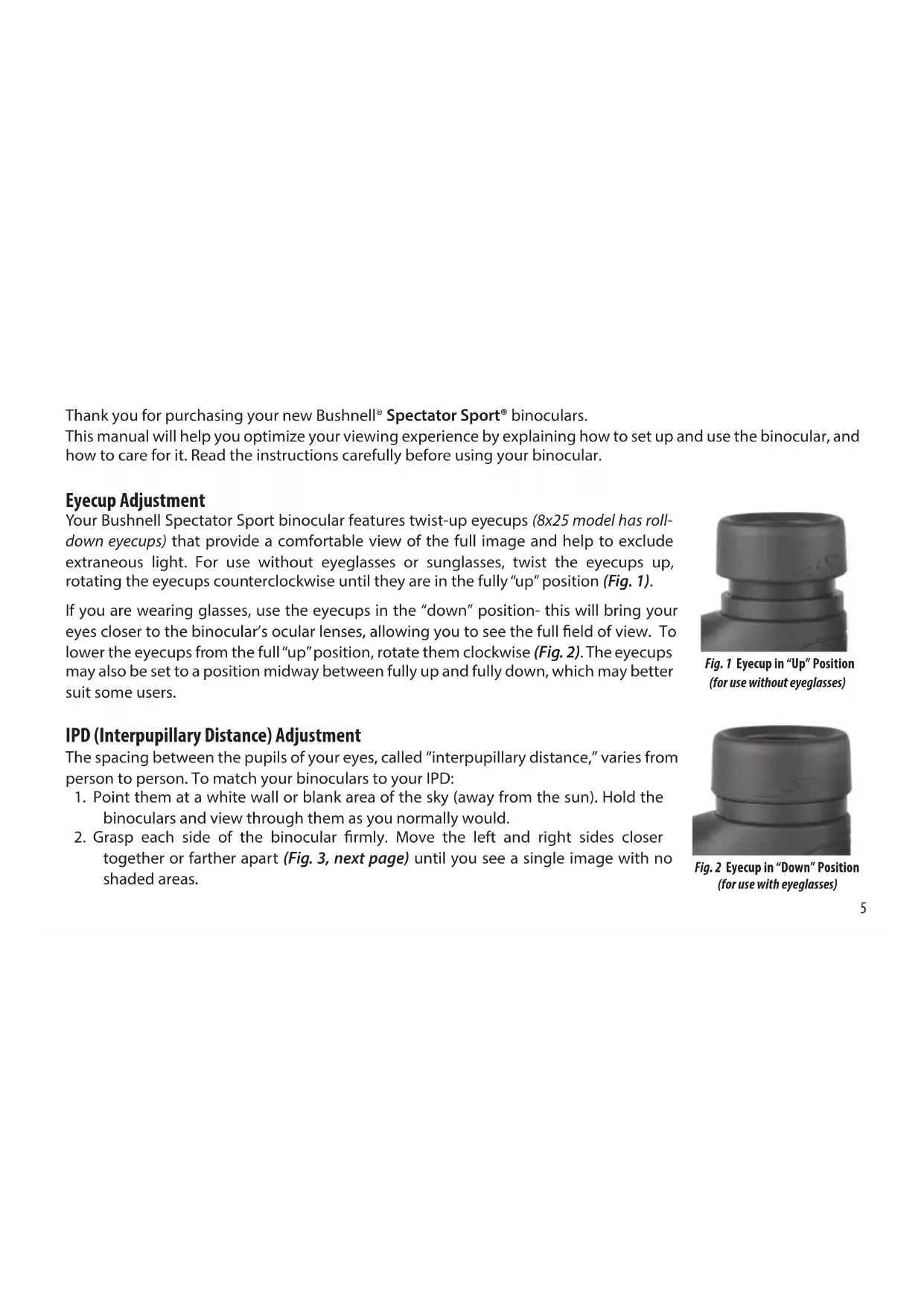 - Personalization - interchangeable black, white, red or blue color accent tiles ENGLISH4 Eyecup (Twist-Up) Strap Lug Objective Lens Ocular Lens (Eyepiece) Strap Lug Ocular Lens (Eyepiece) Eyecup (Roll Down)5 Thank you for purchasing your new Bushnell® Spectator Sport® binoculars. This manual will help you optimize your viewing experience by explaining how to set up and use the binocular, and how to care for it. Read the instructions carefully before using your binocular. Eyecup Adjustment Your Bushnell Spectator Sport binocular features twist-up eyecups (8x25 model has roll- down eyecups) that provide a comfortable view of the full image and help to exclude extraneous light. For use without eyeglasses or sunglasses, twist the eyecups up, rotating the eyecups counterclockwise until they are in the fully “up” position (Fig. 1). If you are wearing glasses, use the eyecups in the “down” position- this will bring your eyes closer to the binocular’s ocular lenses, allowing you to see the full eld of view. To lower the eyecups from the full “up” position, rotate them clockwise (Fig. 2). The eyecups may also be set to a position midway between fully up and fully down, which may better suit some users. IPD (Interpupillary Distance) Adjustment The spacing between the pupils of your eyes, called “interpupillary distance,” varies from person to person. To match your binoculars to your IPD:
