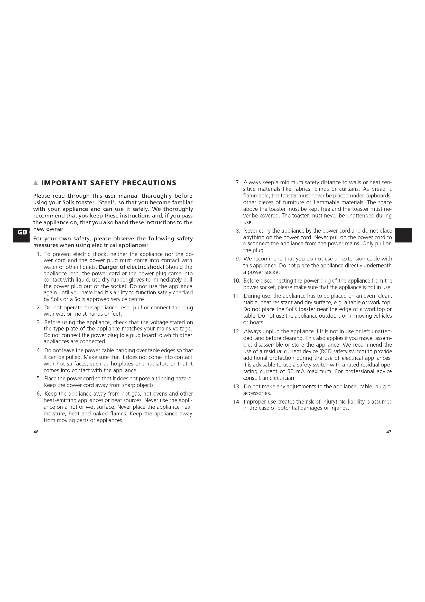 Please read through this user manual thoroughly before using your Solis toaster "Steel", so that you become familiar with your appliance and can use it safely. We thoroughly recommend that you keep these instructions and, if you pass the appliance on, that you also hand these instructions to the new owner. For your own safety, please observe the following safety measures when using elec trical appliances: