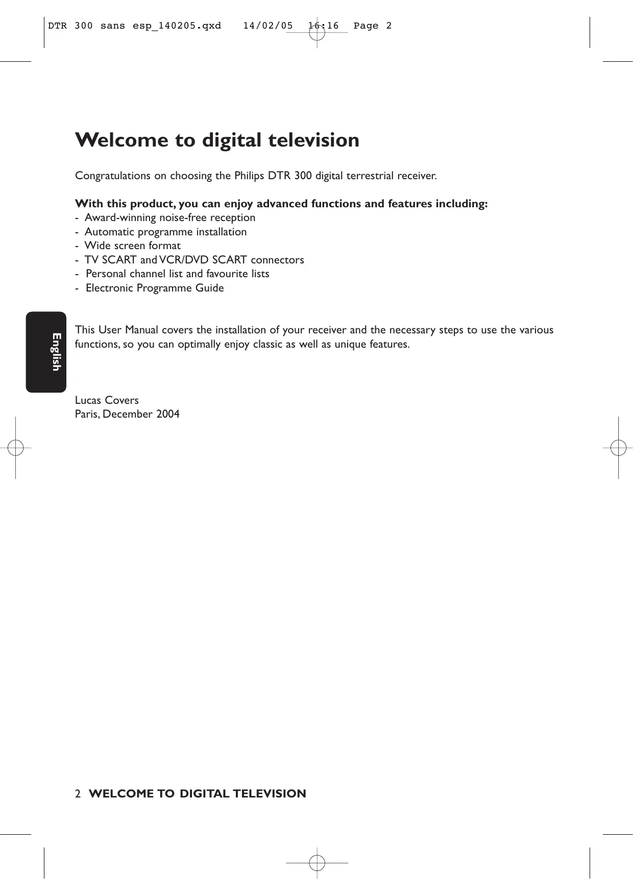 14/02/05 16:16 Page 43 Français DTR 300 sans esp_140205.qxd DTR 300 sans esp_140205.qxd 14/02/05 16:16 Page 2 Welcome to digital television Congratulations on choosing the Philips DTR 300 digital terrestrial receiver. With this product, you can enjoy advanced functions and features including: - Award-winning noise-free reception - Automatic programme installation - Wide screen format - TV SCART and VCR/DVD SCART connectors - Personal channel list and favourite lists - Electronic Programme Guide English This User Manual covers the installation of your receiver and the necessary steps to use the various functions, so you can optimally enjoy classic as well as unique features. Lucas Covers Paris, December 2004