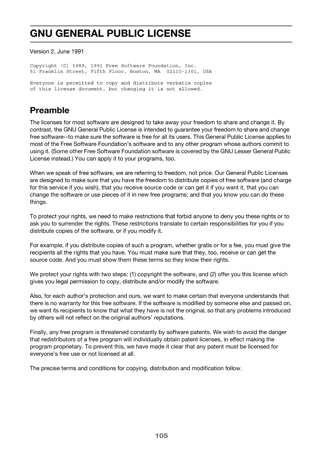 Version 2, June 1991 Copyright (C) 1989, 1991 Free Software Foundation, Inc. 51 Franklin Street, Fifth Floor, Boston, MA 02110-1301, USA Everyone is permitted to copy and distribute verbatim copies of this license document, but changing it is not allowed. Preamble The licenses for most software are designed to take away your freedom to share and change it. By contrast, the GNU General Public License is intended to guarantee your freedom to share and change free software--to make sure the software is free for all its users. This General Public License applies to most of the Free Software Foundation’s software and to any other program whose authors commit to using it. (Some other Free Software Foundation software is covered by the GNU Lesser General Public License instead.) You can apply it to your programs, too. When we speak of free software, we are referring to freedom, not price. Our General Public Licenses are designed to make sure that you have the freedom to distribute copies of free software (and charge for this service if you wish), that you receive source code or can get it if you want it, that you can change the software or use pieces of it in new free programs; and that you know you can do these things. To protect your rights, we need to make restrictions that forbid anyone to deny you these rights or to ask you to surrender the rights. These restrictions translate to certain responsibilities for you if you distribute copies of the software, or if you modify it. For example, if you distribute copies of such a program, whether gratis or for a fee, you must give the recipients all the rights that you have. You must make sure that they, too, receive or can get the source code. And you must show them these terms so they know their rights. We protect your rights with two steps: (1) copyright the software, and (2) offer you this license which gives you legal permission to copy, distribute and/or modify the software. Also, for each author’s protection and ours, we want to make certain that everyone understands that there is no warranty for this free software. If the software is modified by someone else and passed on, we want its recipients to know that what they have is not the original, so that any problems introduced by others will not reflect on the original authors’ reputations. Finally, any free program is threatened constantly by software patents. We wish to avoid the danger that redistributors of a free program will individually obtain patent licenses, in effect making the program proprietary. To prevent this, we have made it clear that any patent must be licensed for everyone’s free use or not licensed at all. The precise terms and conditions for copying, distribution and modification follow.106 TERMS AND CONDITIONS FOR COPYING,