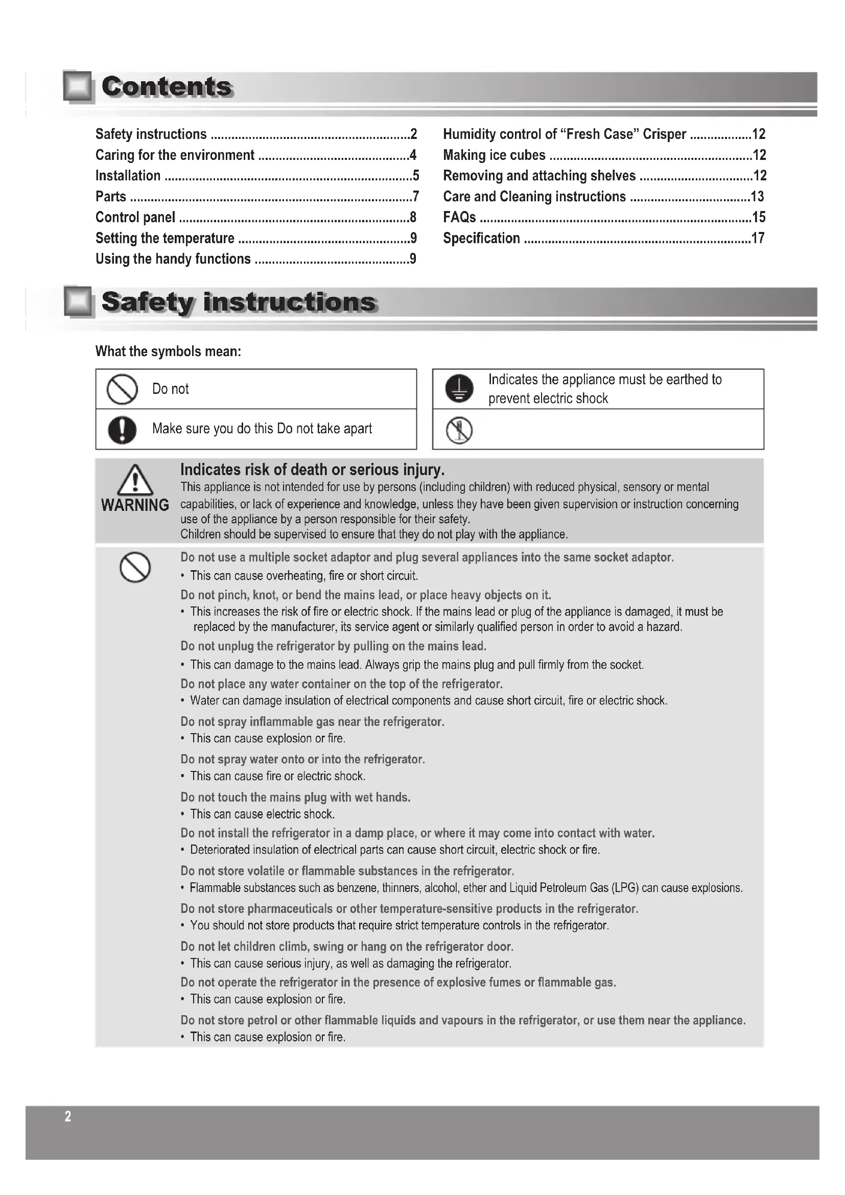 | Make sure the mains lead and plug are not squashed or damaged. ·A damaged mains plug or lead can cause short-circuit, fire or electric shock. ·If the mains lead is damaged, it must be replaced by the manufacturer, its service agent or similarly qualified persons in order to avoid a hazard. ·DO NOT ATTEMPT TO REPLACE IT YOURSELF. Remove any dirt or dust from the mains plug's pins before connecting to the power supply. ·Dust build-up on the mains plug can cause insulation failure, especially in humid conditions. This can cause short circuit, fire or electric shock. Unplug the mains lead and wipe it with a dry cloth. Never use a wet or damp cloth. Plug your appliance into the socket, making sure the connection is secure. ·A loosely connected mains plug can cause fire or electric shock. Install the refrigerator in a well-ventilated area. ·The more refrigerant there is in an appliance, the larger the room it should be installed in. If there's a refrigerant fluid leak, and the appliance is in a small room, the build up of combustible gases is more likely. This can cause fire or explosion. As a guide, for every 8 g of coolant, you'll need at least 1 cubic metre of space in the room. The data plate inside the appliance tells you how much refrigerant your refrigerator contains. The refrigerant (R600a) used in the refrigerator and the gases in the insulation material (cyclopentane) are both flammable. They also require special disposal procedures. ·Before you dispose of the appliance, make sure none of the pipes on the back are damaged. Refrigerant or gas leaks can cause fire or explosion. Unplug the refrigerator before cleaning and servicing. ·Failure to do this can cause electric shock. If you smell burning or see smoke coming from the refrigerator, disconnect the power immediately and please consult authorized service centre. ·Failure to do this can cause fire or electric shock. Keep ventilation openings, in the appliance enclosure or in the built-in structure, clear of obstruction. ·Failure to do this could result in fire or explosion because refrigerant cannot disperse if it leaks. | |