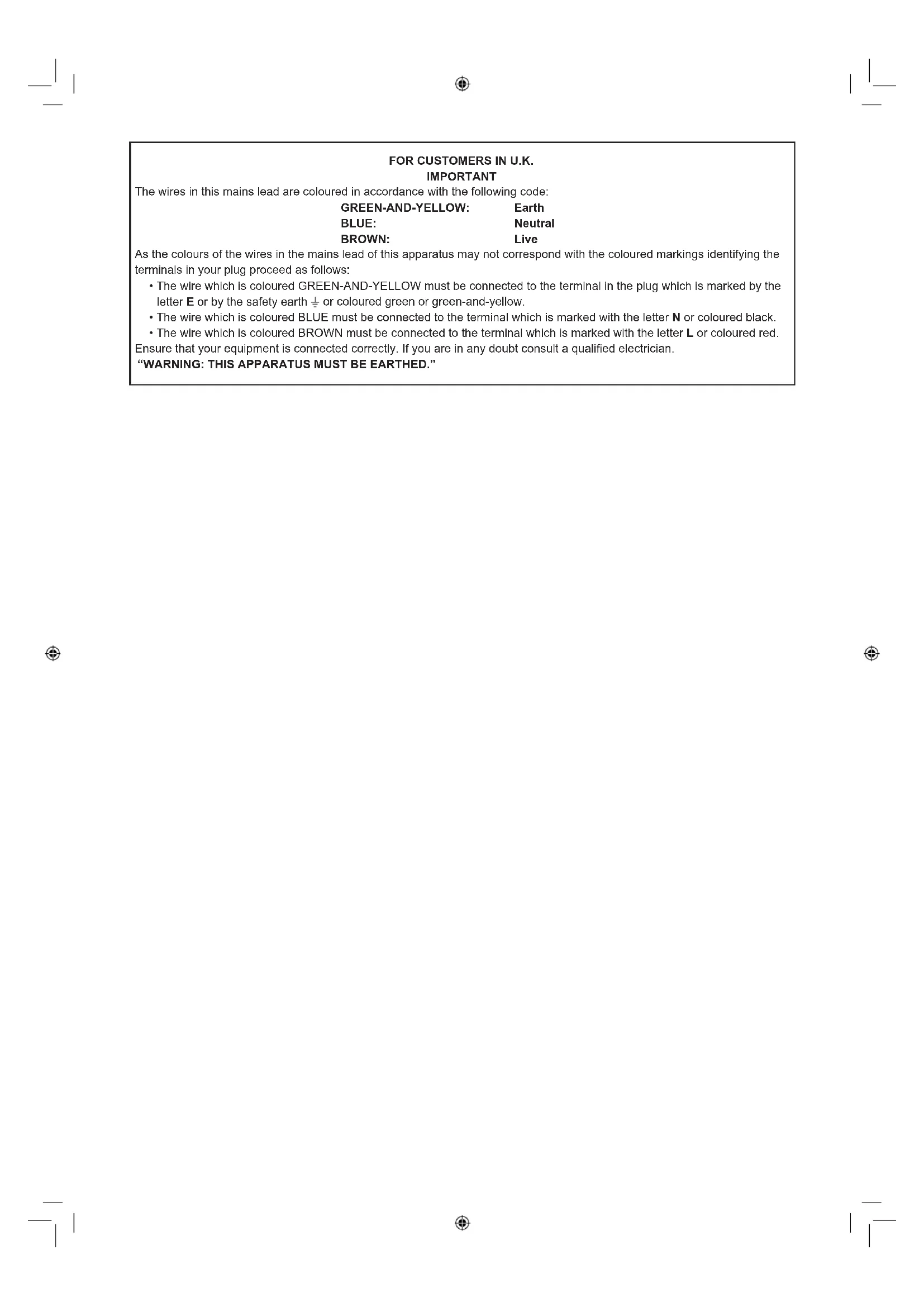 - The wire which is coloured BROWN must be connected to the terminal which is marked with the letter L or coloured red. Ensure that your equipment is connected correctly. If you are in any doubt consult a qualied electrician. “WARNING: THIS APPARATUS MUST BE EARTHED.”ENGLISH