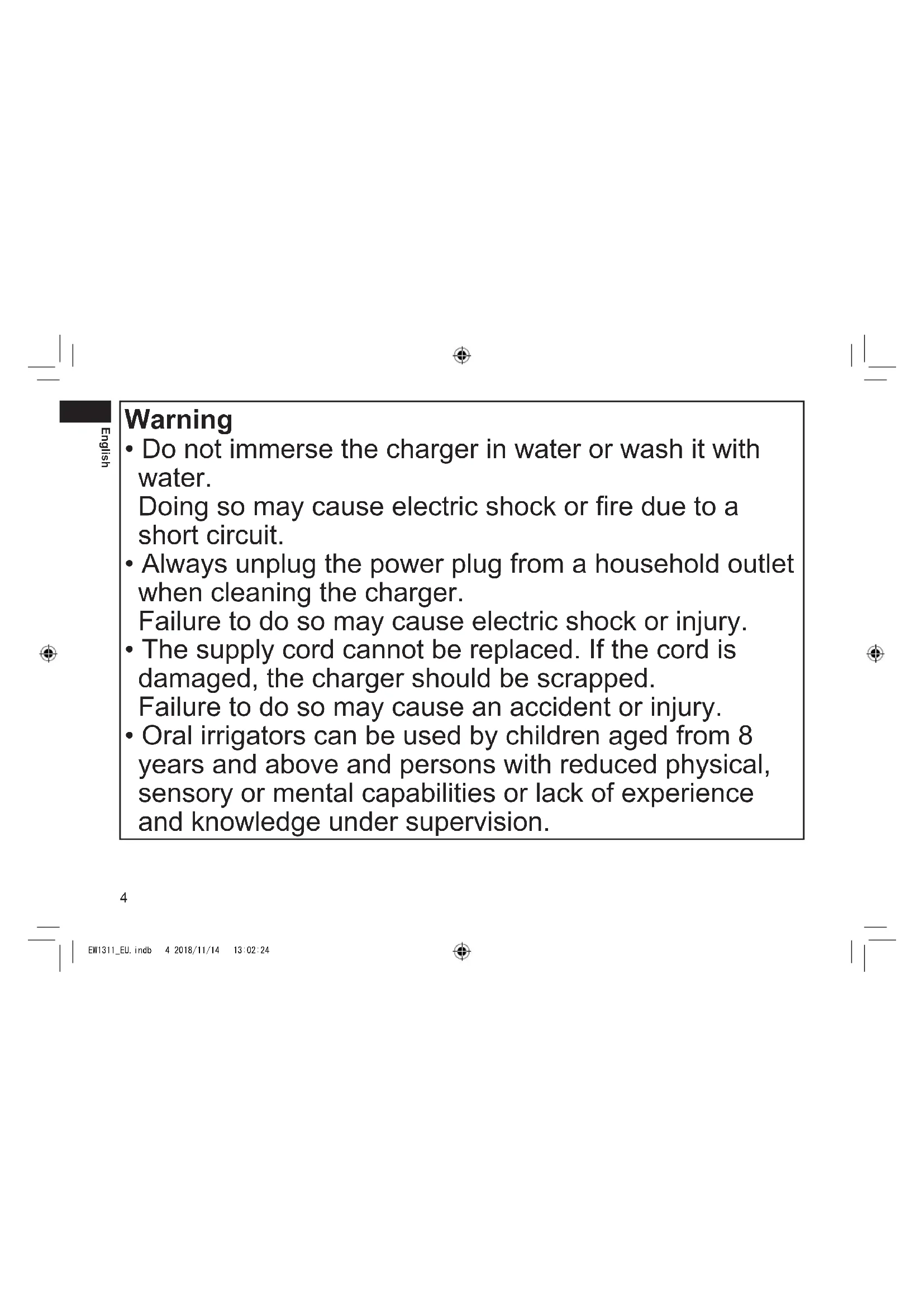 - Oral irrigators can be used by children aged from 8 years and above and persons with reduced physical, sensory or mental capabilities or lack of experience and knowledge under supervision. EW1311_EU.indb 4 2018/11/14 13:02:245 English