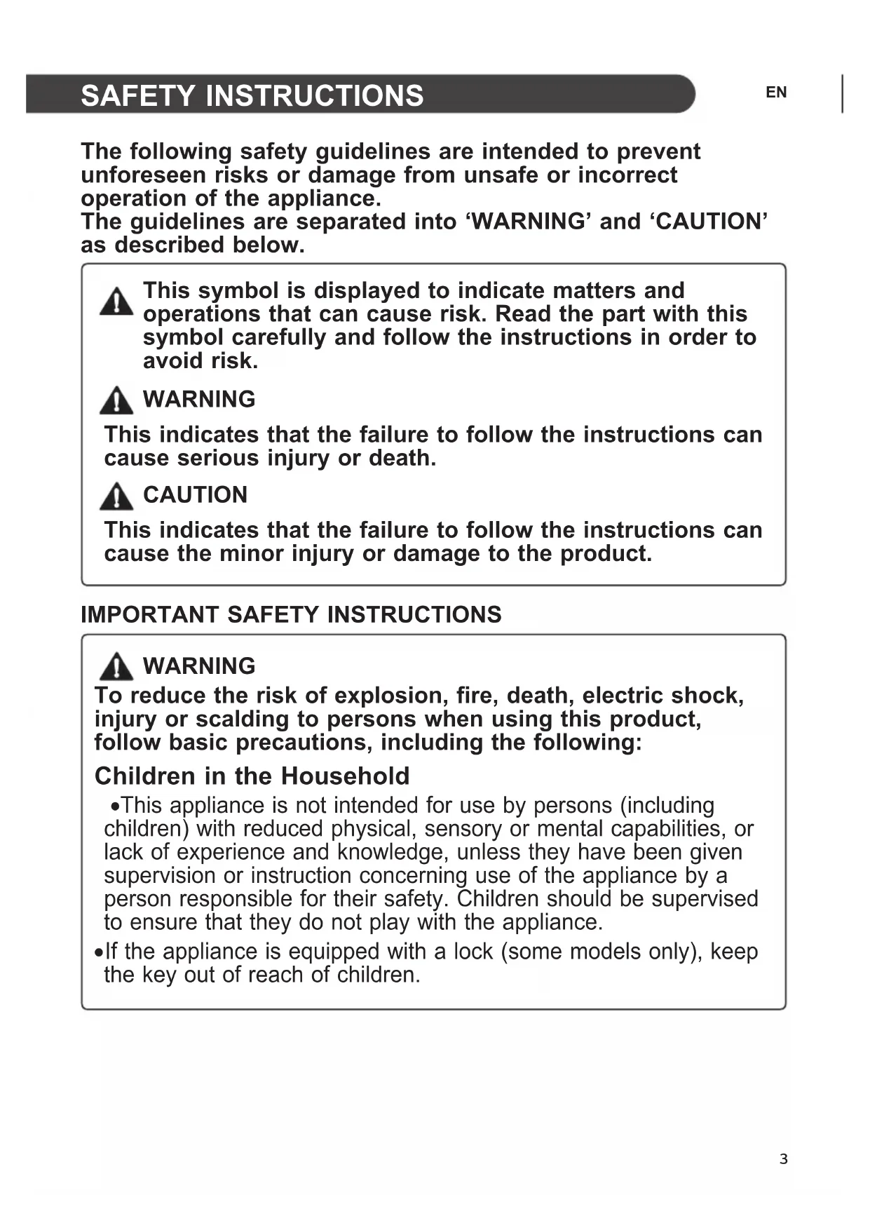 The following safety guidelines are intended to prevent unforeseen risks or damage from unsafe or incorrect operation of the appliance. The guidelines are separated into ‘WARNING’ and ‘CAUTION’ as described below. This symbol is displayed to indicate matters and operations that can cause risk. Read the part with this symbol carefully and follow the instructions in order to avoid risk. WARNING This indicates that the failure to follow the instructions can cause serious injury or death. CAUTION This indicates that the failure to follow the instructions can cause the minor injury or damage to the product.
