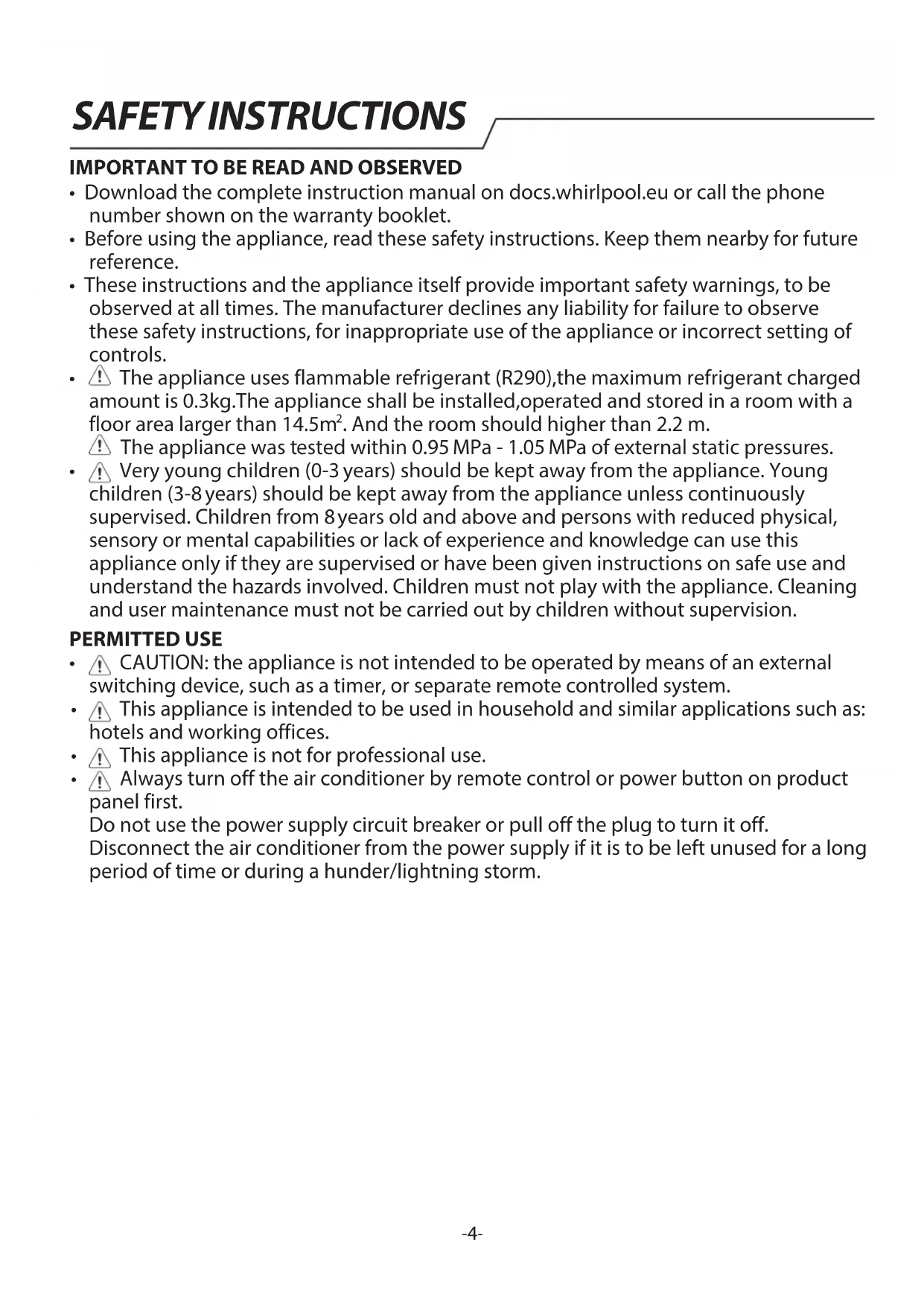 Installation, including electrical connections, and repairs must be carried out by a qualified technician according to national wiring rules. Do not repair or replace any part of the appliance unless specifically stated in the user manual. Keep children away from the installation site. After unpacking the appliance, make sure that it has not been damaged during transport. In the event of problems, contact the dealer or your nearest After-sales Service. Once installed, packaging waste (plastic, styrofoam parts etc.) must be stored out of reach of children - risk of suffocation. The appliance must be disconnected from all remote power supply before any installation operation - risk of electric shock. During installation, make sure the appliance does not damage the power cable - risk of fire or electric shock. Only activate the appliance when the installation has been completed. The flexible exhaust hose allows placement of the air conditioner between 23” and 67” (60 cm and 170 cm) from window or door. The appliance with supplementary heater needs to be kept a minimum distance of 100 cm from the combustible surface.-6- SAFETY INSTRUCTIONS