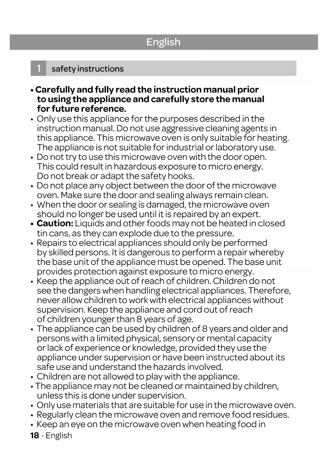 Only use this appliance for the purposes described in the instruction manual. Do not use aggressive cleaning agents in this appliance. This microwave oven is only suitable for heating. The appliance is not suitable for industrial or laboratory use.