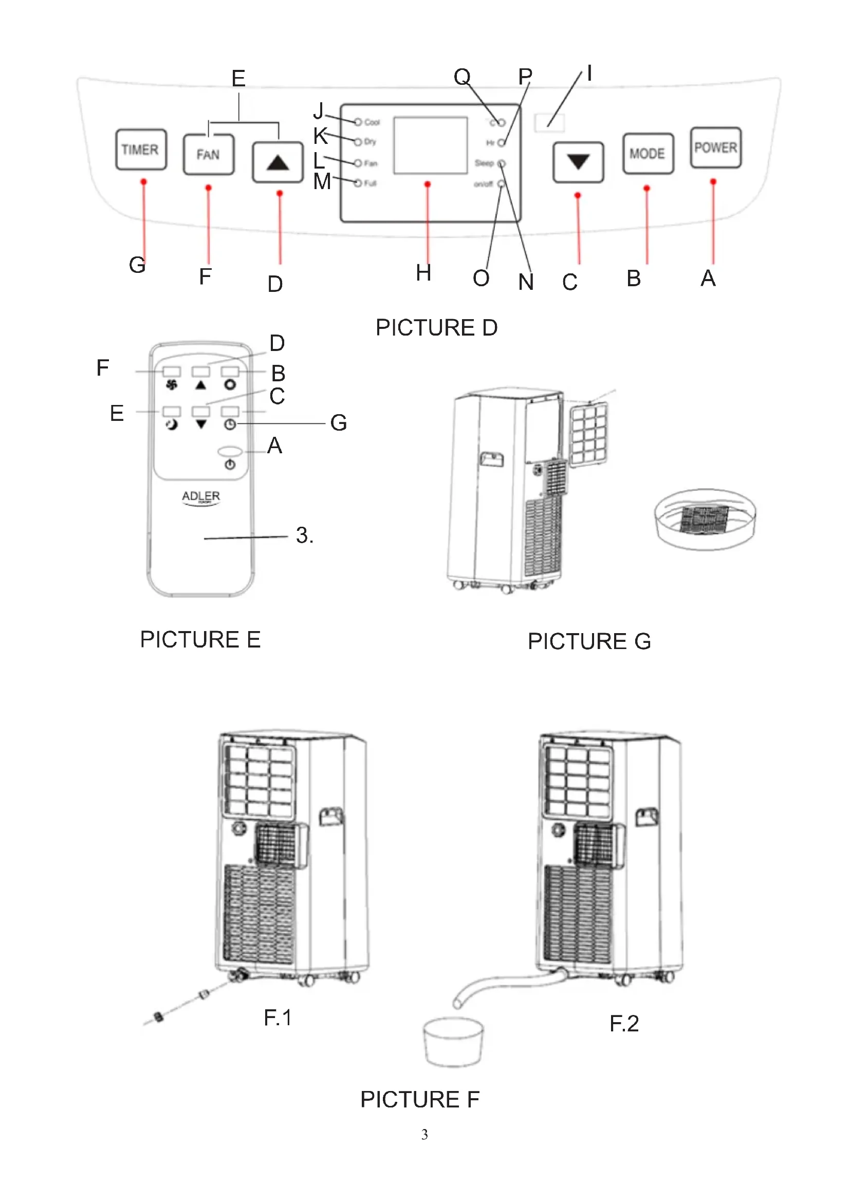 Press button “E” to select the Sleep Mode: Switch off the device and then press the button “G”, next press up button “D” or down button “C” to select the required time value. The maximum power on delay time is 24 hours. The device will be switched on after the delay time has elapsed. PROTECTION DEVICES - In the cooling mode, press both buttons “F” and “D” to turn on the sleep mode, then the unit will work on Energy - Saving and quiet type. The sleep model control lamp “N” will switch on the control panel. Button "B" - press it to select operation mode: cool mode → dry mode → fan mode. Remote controller – Picture E E. Sleep model F. Fan speed button G. Timer button CONTROL PANEL operation – picture D Press button “A” to turn on and turn off the machine, the buzzer will play signal once. The control lamp “O” will switch on the control panel. Press button “B” to switch mode, between cooling mode → fan mode → dehumidifying mode. A. Power button B. Mode button C. Timer / Temperature down button D. Timer / Temperature up button