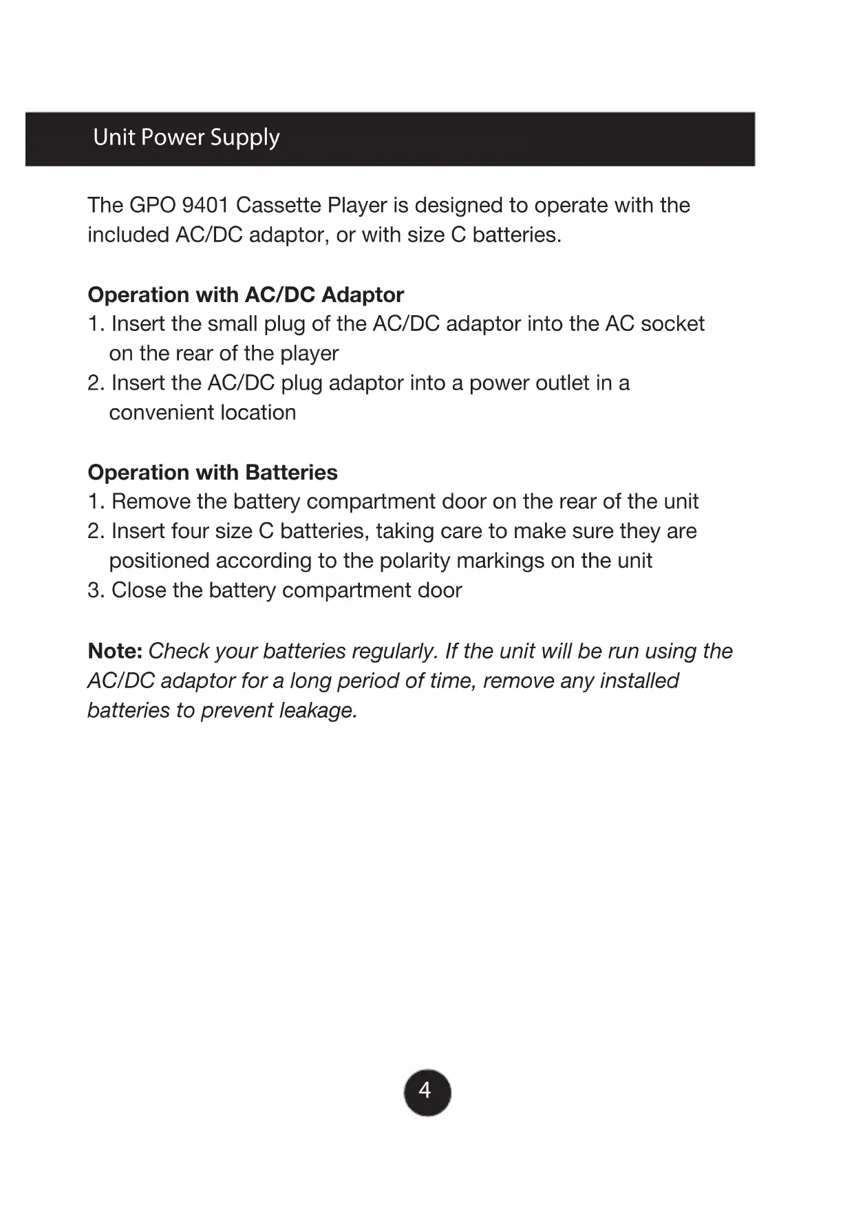 The GPO 9401 Cassette Player is designed to operate with the included AC/DC adaptor, or with size C batteries.