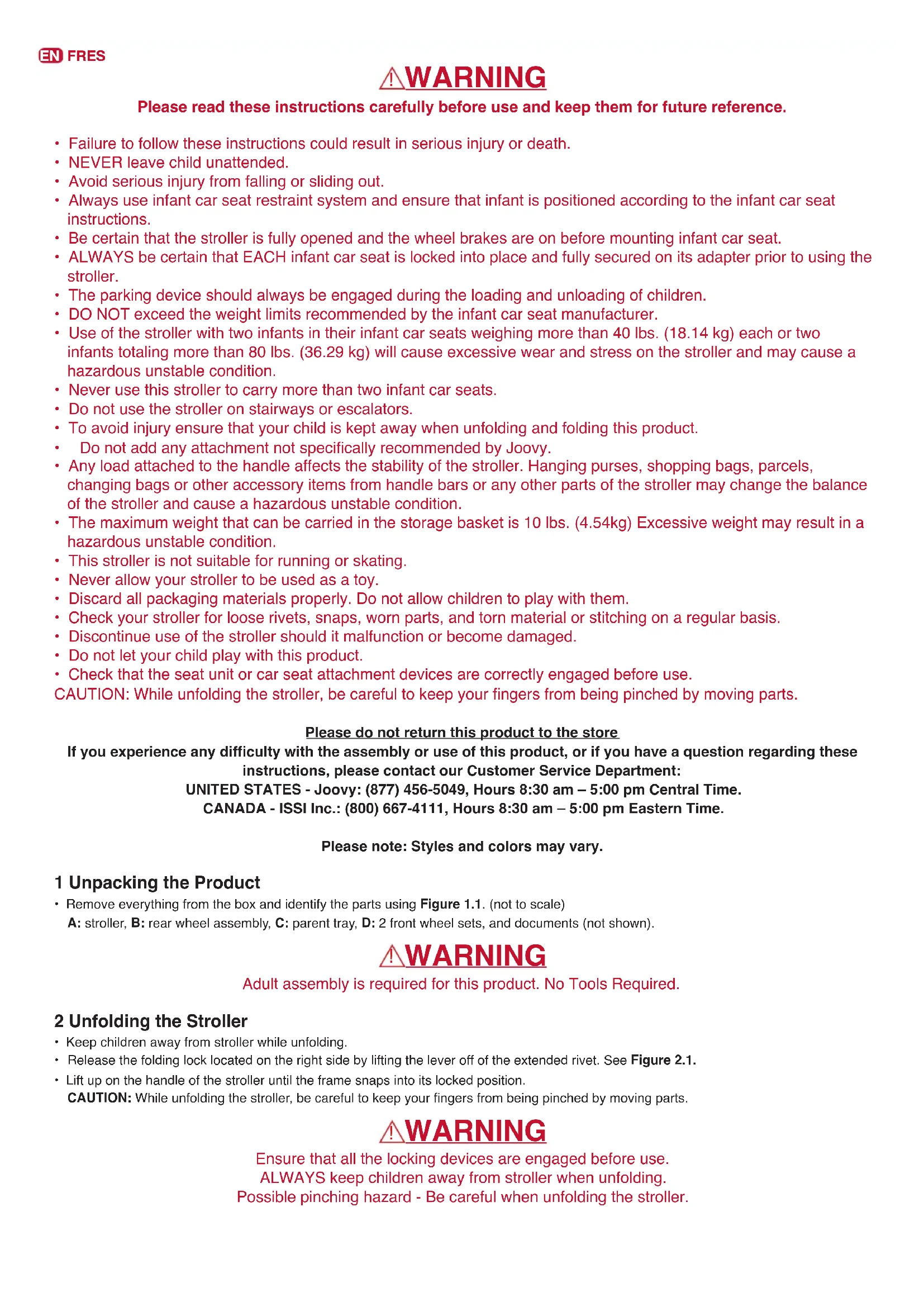 - Check that the seat unit or car seat attachment devices are correctly engaged before use. CAUTION:Whileunfoldingthestroller,becarefultokeepyourngersfrombeingpinchedbymovingparts. Please do not return this product to the store If you experience any difculty with the assembly or use of this product, or if you have a question regarding these instructions, please contact our Customer Service Department: UNITED STATES - Joovy: (877) 456-5049, Hours 8:30 am – 5:00 pm Central Time. CANADA - ISSI Inc.: (800) 667-4111, Hours 8:30 am – 5:00 pm Eastern Time. Please note: Styles and colors may vary. 1 Unpacking the Product