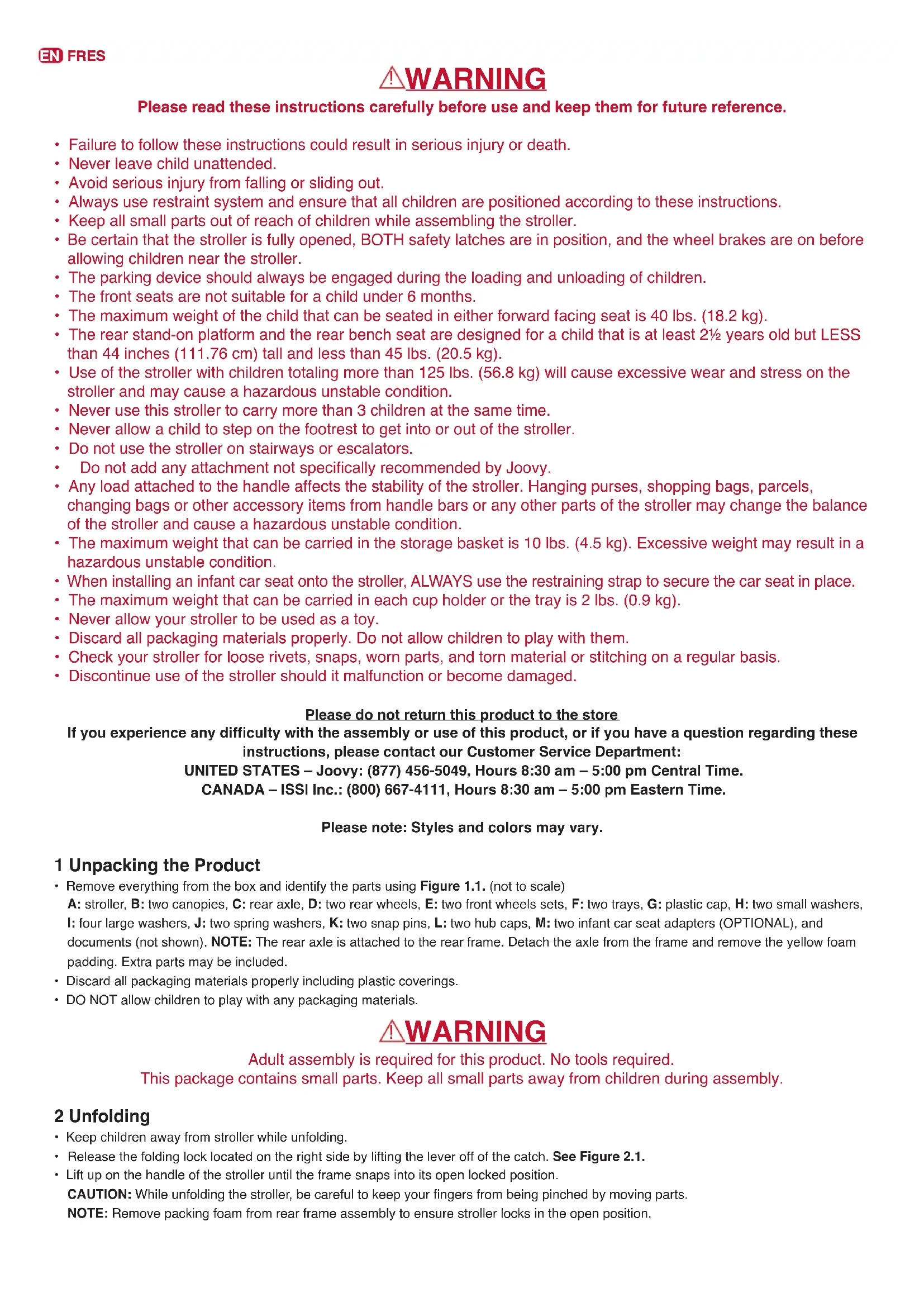 - Discontinue use of the stroller should it malfunction or become damaged. Please do not return this product to the store If you experience any difculty with the assembly or use of this product, or if you have a question regarding these instructions, please contact our Customer Service Department: UNITED STATES – Joovy: (877) 456-5049, Hours 8:30 am – 5:00 pm Central Time. CANADA – ISSI Inc.: (800) 667-4111, Hours 8:30 am – 5:00 pm Eastern Time. Please note: Styles and colors may vary. 1 Unpacking the Product