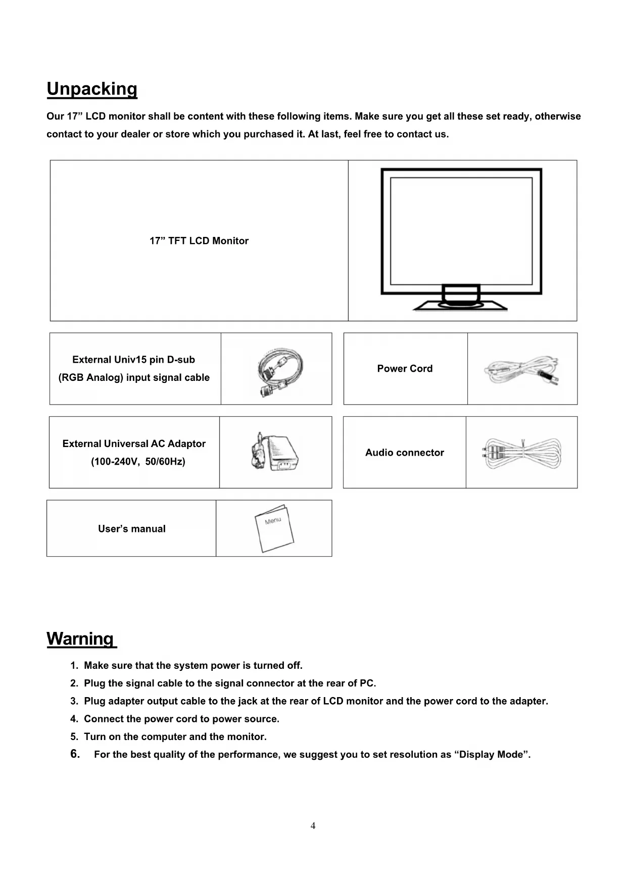 All Information in this manual may change from time to time without prior notice.3 View of Monitor4 Unpacking Our 17” LCD monitor shall be content with these following items. Make sure you get all these set ready, otherwise contact to your dealer or store which you purchased it. At last, feel free to contact us. 17” TFT LCD Monitor