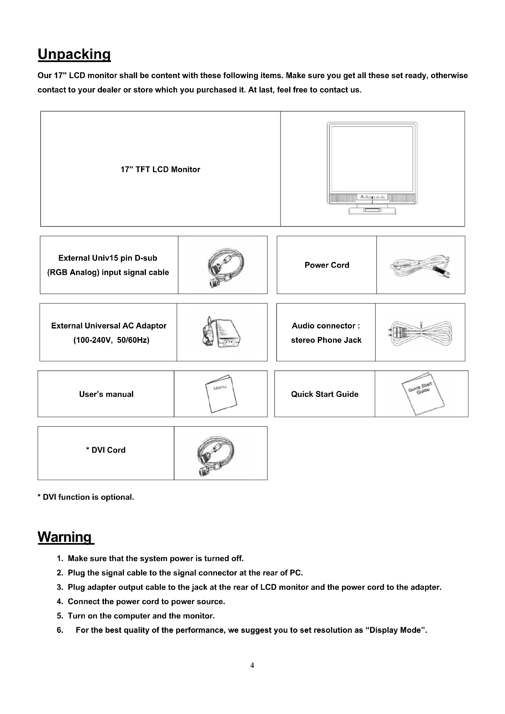 All Information in this manual may change from time to time without prior notice.3 View of Monitor4 Unpacking Our 17” LCD monitor shall be content with these following items. Make sure you get all these set ready, otherwise contact to your dealer or store which you purchased it. At last, feel free to contact us. 17” TFT LCD Monitor