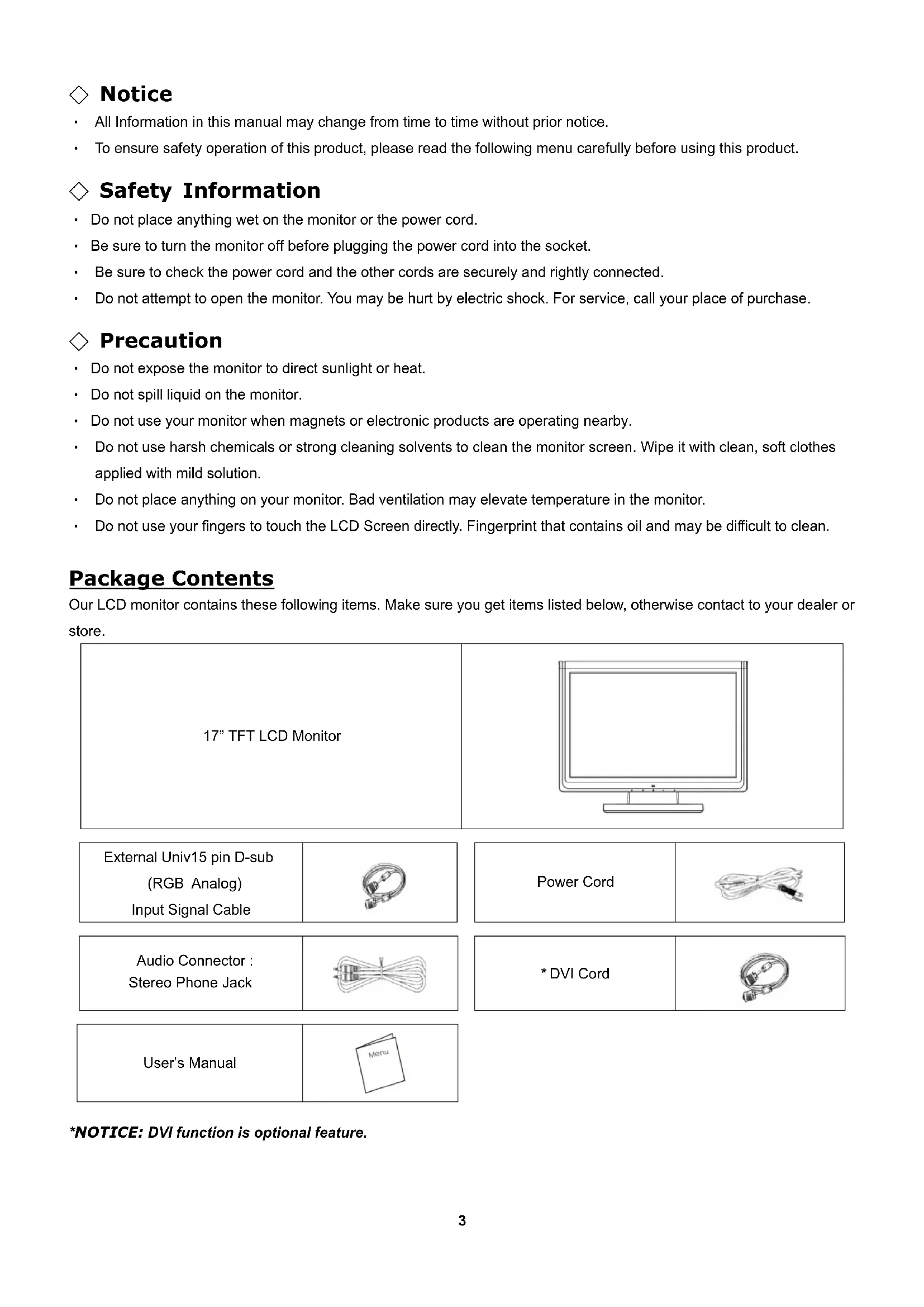 - Control Buttons………………………………………………………………………………………………….4 OSD (On-Screen Display) Menu Mode……………………………………………………………………5-6 Troubleshooting……………………………………………………………………………………………… Supported Timing………………………………………………………………………………………………7 Specification……………………………………………………………………………………………………83 ◇ Notice ‧ All Information in this manual may change from time to time without prior notice. ‧ To ensure safety operation of this product, please read the following menu carefully before using this product. ◇ Safety Information ‧ Do not place anything wet on the monitor or the power cord. ‧ Be sure to turn the monitor off before plugging the power cord into the socket. ‧ Be sure to check the power cord and the other cords are securely and rightly connected. ‧ Do not attempt to open the monitor. You may be hurt by electric shock. For service, call your place of purchase. ◇ Precaution ‧ Do not expose the monitor to direct sunlight or heat. ‧ Do not spill liquid on the monitor. ‧ Do not use your monitor when magnets or electronic products are operating nearby. ‧ Do not use harsh chemicals or strong cleaning solvents to clean the monitor screen. Wipe it with clean, soft clothes applied with mild solution. ‧ Do not place anything on your monitor. Bad ventilation may elevate temperature in the monitor. ‧ Do not use your fingers to touch the LCD Screen directly. Fingerprint that contains oil and may be difficult to clean. Package Contents Our LCD monitor contains these following items. Make sure you get items listed below, otherwise contact to your dealer or store. 17” TFT LCD Monitor p. 7