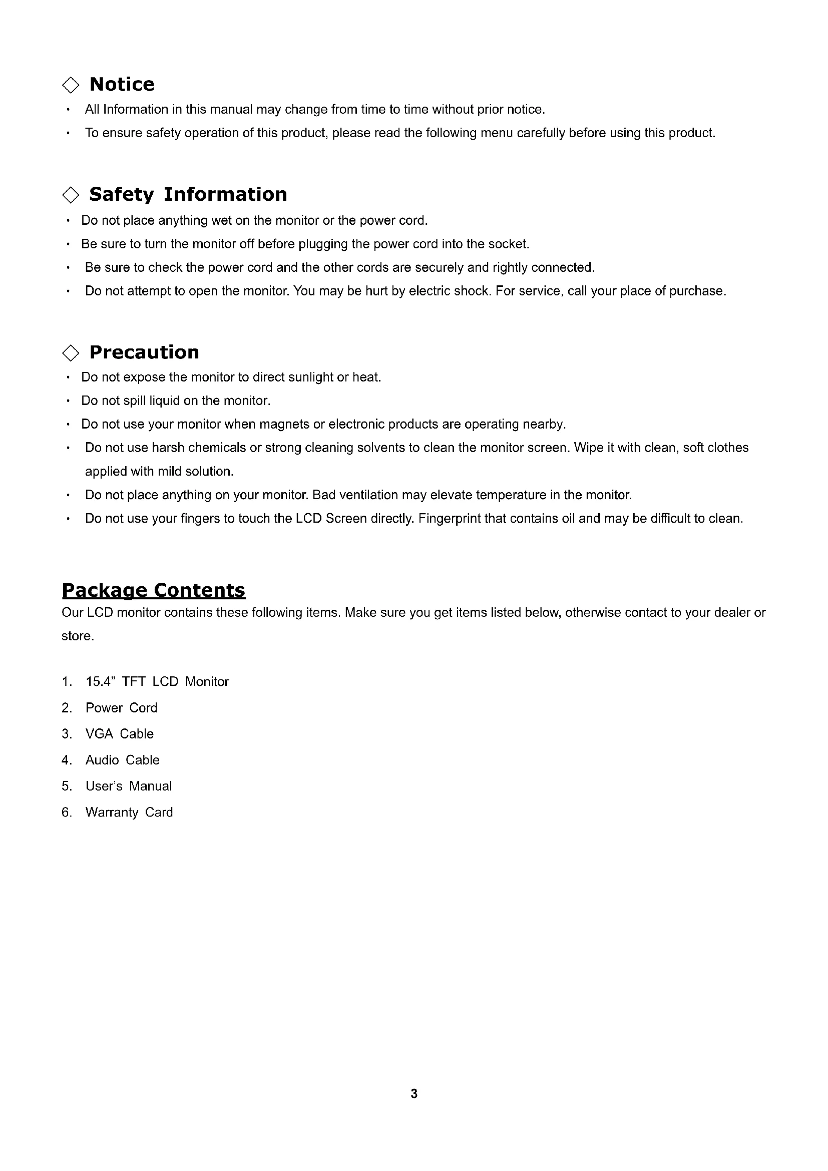 Package Contents Our LCD monitor contains these following items. Make sure you get items listed below, otherwise contact to your dealer or store.