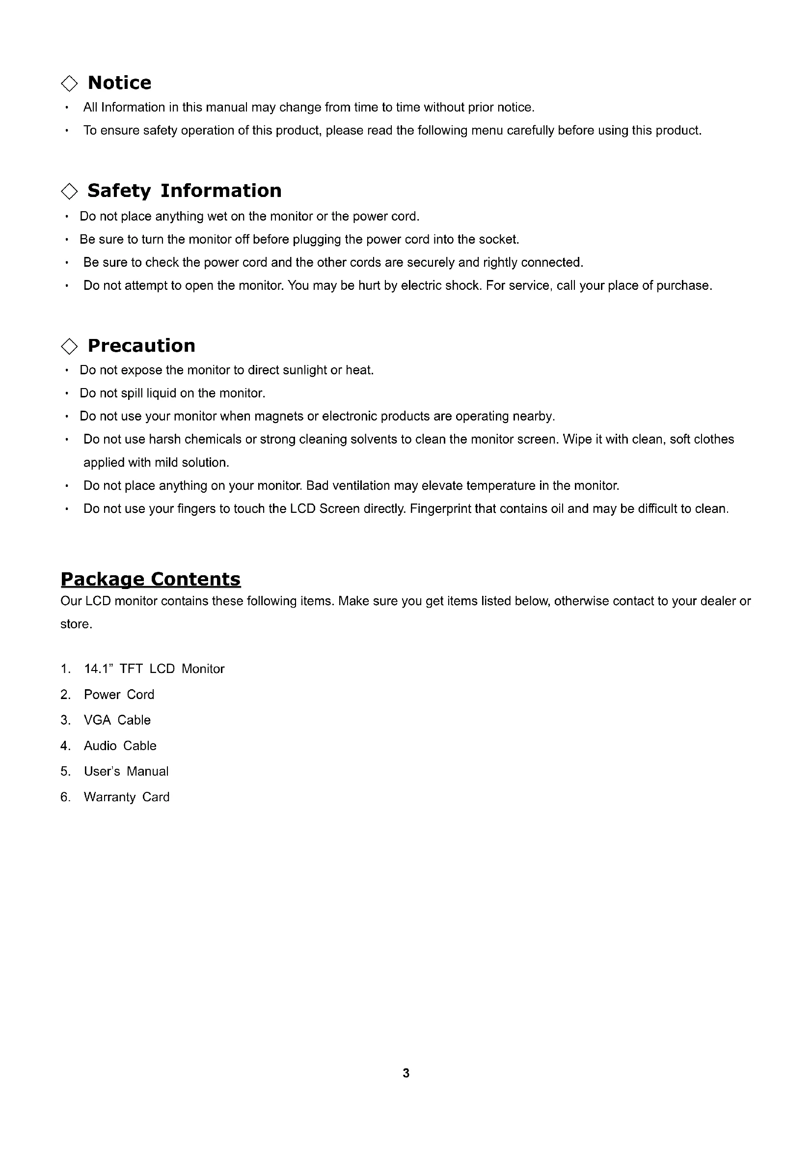 Package Contents Our LCD monitor contains these following items. Make sure you get items listed below, otherwise contact to your dealer or store.