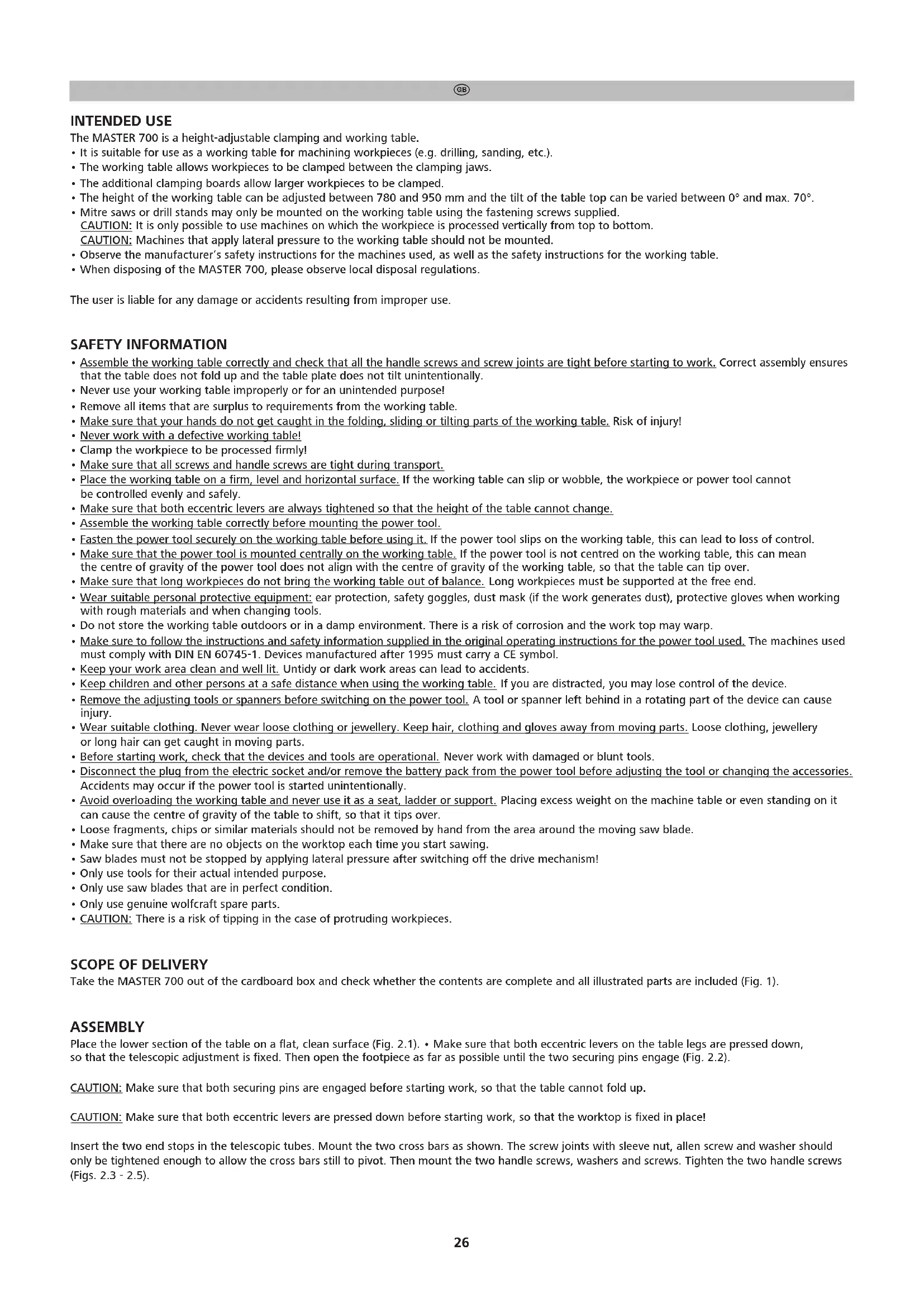 Take the MASTER 700 out of the cardboard box and check whether the contents are complete and all illustrated parts are included (Fig. 1). ASSEMBLY Place the lower section of the table on a flat, clean surface (Fig. 2.1). • Make sure that both eccentric levers on the table legs are pressed down, so that the telescopic adjustment is fixed. Then open the footpiece as far as possible until the two securing pins engage (Fig. 2.2). CAUTION: Make sure that both securing pins are engaged before starting work, so that the table cannot fold up. CAUTION: Make sure that both eccentric levers are pressed down before starting work, so that the worktop is fixed in place! Insert the two end stops in the telescopic tubes. Mount the two cross bars as shown. The screw joints with sleeve nut, allen screw and washer should only be tightened enough to allow the cross bars still to pivot. Then mount the two handle screws, washers and screws. Tighten the two handle screws (Figs. 2.3 - 2.5).27