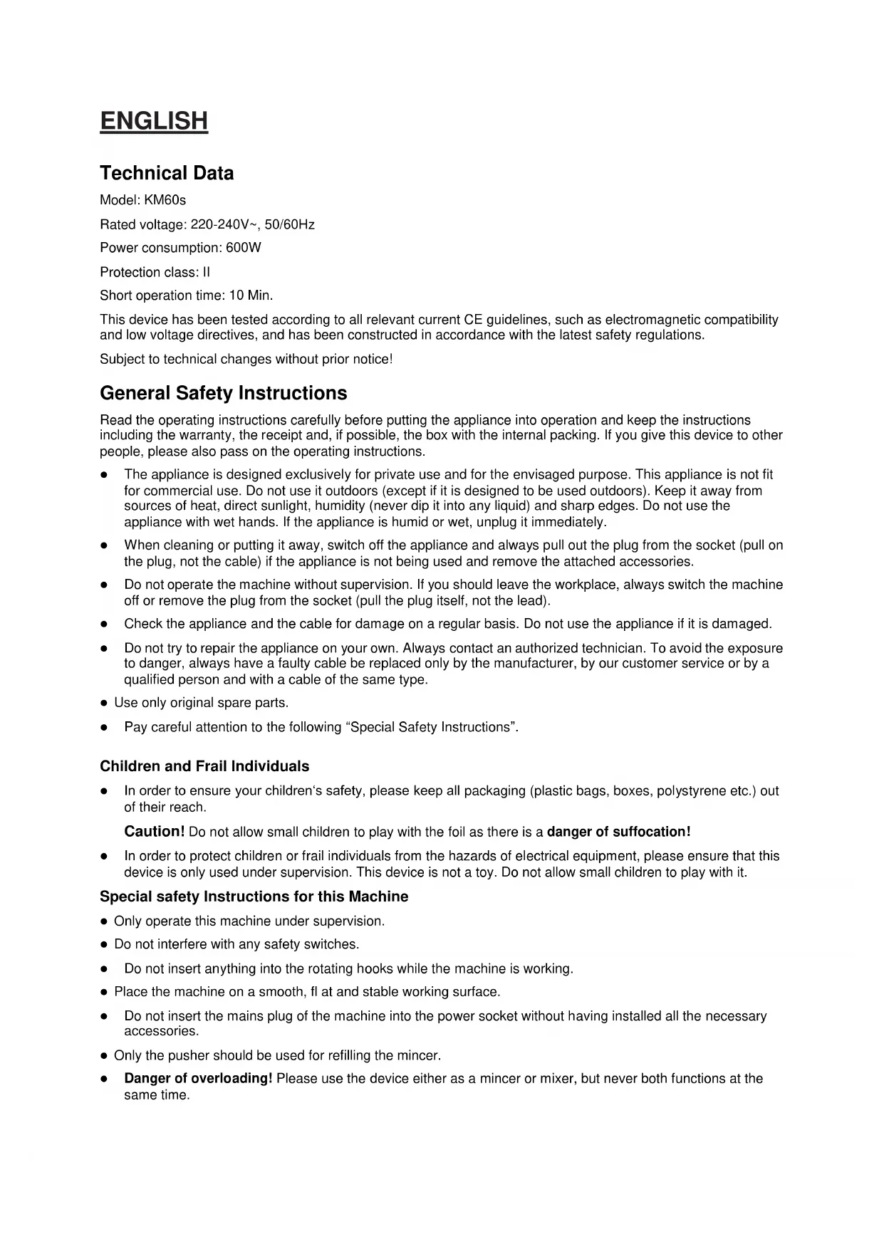 Instruction manual Manuel d'Utilisation Benutzerhandbuch Gebruiksaanwijzing Manual de Usuario Manuale d’usoENGLISH Technical Data Model: KM60s Rated voltage: 220-240V~, 50/60Hz Power consumption: 600W Protection class: II Short operation time: 10 Min. This device has been tested according to all relevant current CE guidelines, such as electromagnetic compatibility and low voltage directives, and has been constructed in accordance with the latest safety regulations. Subject to technical changes without prior notice! General Safety Instructions Read the operating instructions carefully before putting the appliance into operation and keep the instructions including the warranty, the receipt and, if possible, the box with the internal packing. If you give this device to other people, please also pass on the operating instructions. The appliance is designed exclusively for private use and for the envisaged purpose. This appliance is not fit for commercial use. Do not use it outdoors (except if it is designed to be used outdoors). Keep it away from sources of heat, direct sunlight, humidity (never dip it into any liquid) and sharp edges. Do not use the appliance with wet hands. If the appliance is humid or wet, unplug it immediately. When cleaning or putting it away, switch off the appliance and always pull out the plug from the socket (pull on the plug, not the cable) if the appliance is not being used and remove the attached accessories. Do not operate the machine without supervision. If you should leave the workplace, always switch the machine off or remove the plug from the socket (pull the plug itself, not the lead). Check the appliance and the cable for damage on a regular basis. Do not use the appliance if it is damaged. Do not try to repair the appliance on your own. Always contact an authorized technician. To avoid the exposure to danger, always have a faulty cable be replaced only by the manufacturer, by our customer service or by a qualified person and with a cable of the same type. Use only original spare parts. Pay careful attention to the following “Special Safety Instructions”. Children and Frail Individuals In order to ensure your children‘s safety, please keep all packaging (plastic bags, boxes, polystyrene etc.) out of their reach. Caution! Do not allow small children to play with the foil as there is a danger of suffocation! In order to protect children or frail individuals from the hazards of electrical equipment, please ensure that this device is only used under supervision. This device is not a toy. Do not allow small children to play with it. Special safety Instructions for this Machine Only operate this machine under supervision. Do not interfere with any safety switches. Do not insert anything into the rotating hooks while the machine is working. Place the machine on a smooth, fl at and stable working surface. Do not insert the mains plug of the machine into the power socket without having installed all the necessary accessories. Only the pusher should be used for refilling the mincer. Danger of overloading! Please use the device either as a mincer or mixer, but never both functions at the same time.Overview of the Components