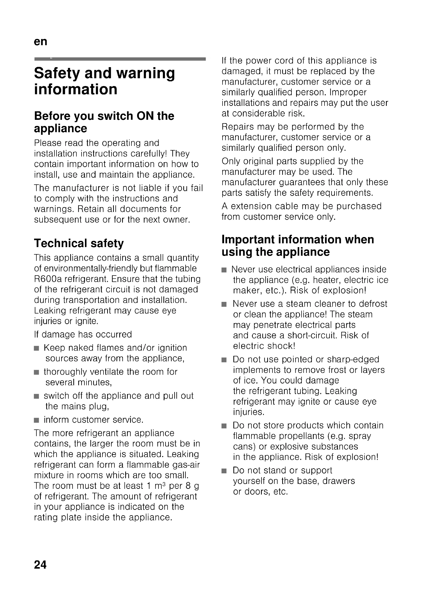 enTable of Conte nts enInstruction for Use Safety and warning information Before you switch ON the appliance Please read the operating and installation instructions carefully! They contain important information on how to install, use and maintain the appliance. The manufacturer is not liable if you fail to comply with the instructions and warnings. Retain all documents for subsequent use or for the next owner. Technical safety This appliance contains a small quantity of environmentally-friendly but flammable R600a refrigerant. Ensure that the tubing of the refrigerant circuit is not damaged during transportation and installation. Leaking refrigerant may cause eye injuries or ignite. If damage has occurred ■ Keep naked flames and/or ignition sources away from the appliance, ■ thoroughly ventilate the room for several minutes, ■ switch off the appliance and pull out the mains plug, ■ inform customer service. The more refrigerant an appliance contains, the larger the room must be in which the appliance is situated. Leaking refrigerant can form a flammable gas-air mixture in rooms which are too small. The room must be at least 1 m³ per 8 g of refrigerant. The amount of refrigerant in your appliance is indicated on the rating plate inside the appliance. If the power cord of this appliance is damaged, it must be replaced by the manufacturer, customer service or a similarly qualified person. Improper installations and repairs may put the user at considerable risk. Repairs may be performed by the manufacturer, customer service or a similarly qualified person only. Only original parts supplied by the manufacturer may be used. The manufacturer guarantees that only these parts satisfy the safety requirements. A extension cable may be purchased from customer service only. Important information when using the appliance ■ Never use electrical appliances inside the appliance (e.g. heater, electric ice maker, etc.). Risk of explosion! ■ Never use a steam cleaner to defrost or clean the appliance! The steam may penetrate electrical parts and cause a short-circuit. Risk of electric shock! ■ Do not use pointed or sharp-edged implements to remove frost or layers of ice. You could damage the refrigerant tubing. Leaking refrigerant may ignite or cause eye injuries. ■ Do not store products which contain flammable propellants (e.g. spray cans) or explosive substances in the appliance. Risk of explosion! ■ Do not stand or support yourself on the base, drawers or doors, etc.en