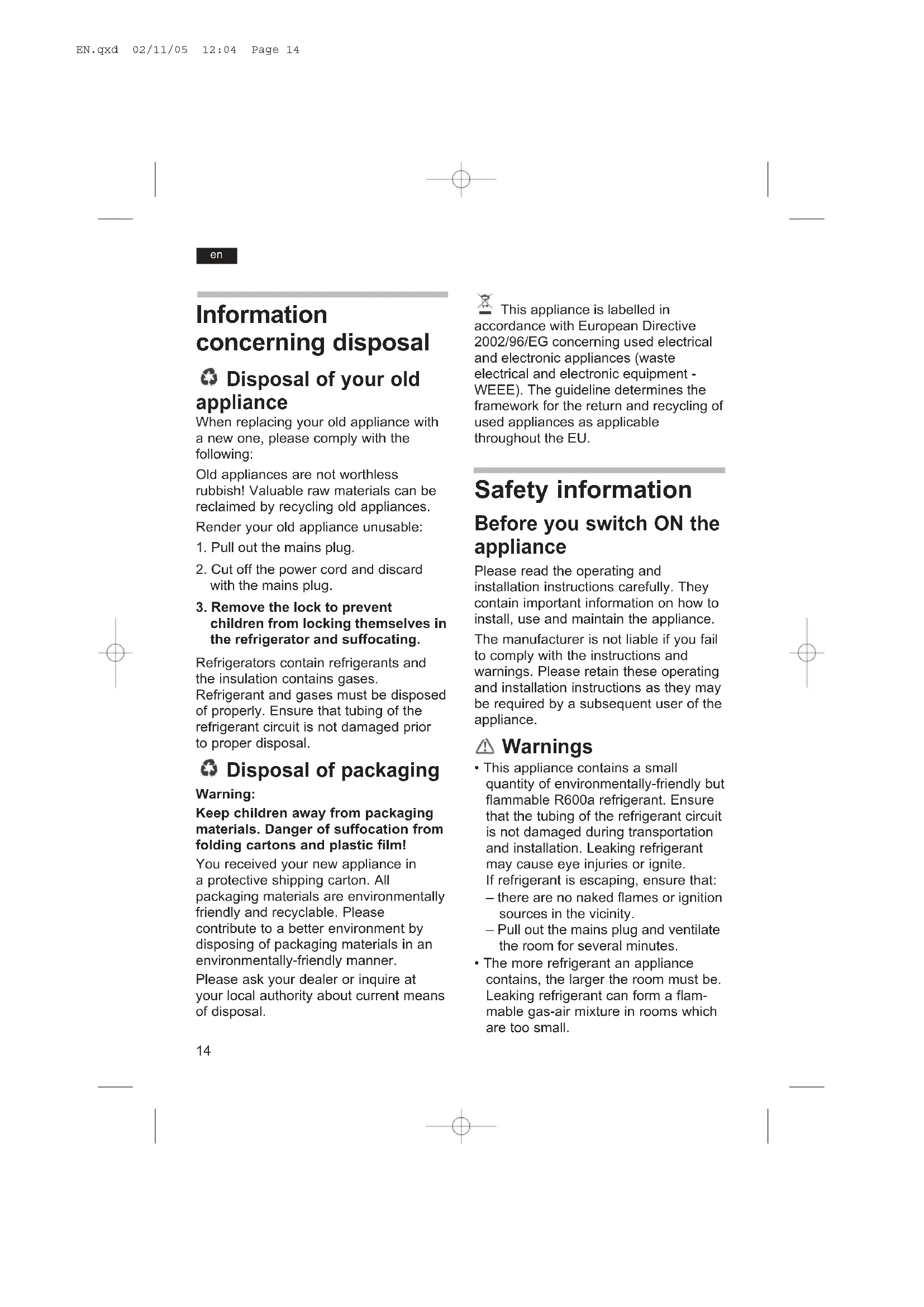 - The more refrigerant an appliance contains, the larger the room must be. Leaking refrigerant can form a flam- mable gas-air mixture in rooms which are too small. EN.qxd 02/11/05 12:04 Page 1415