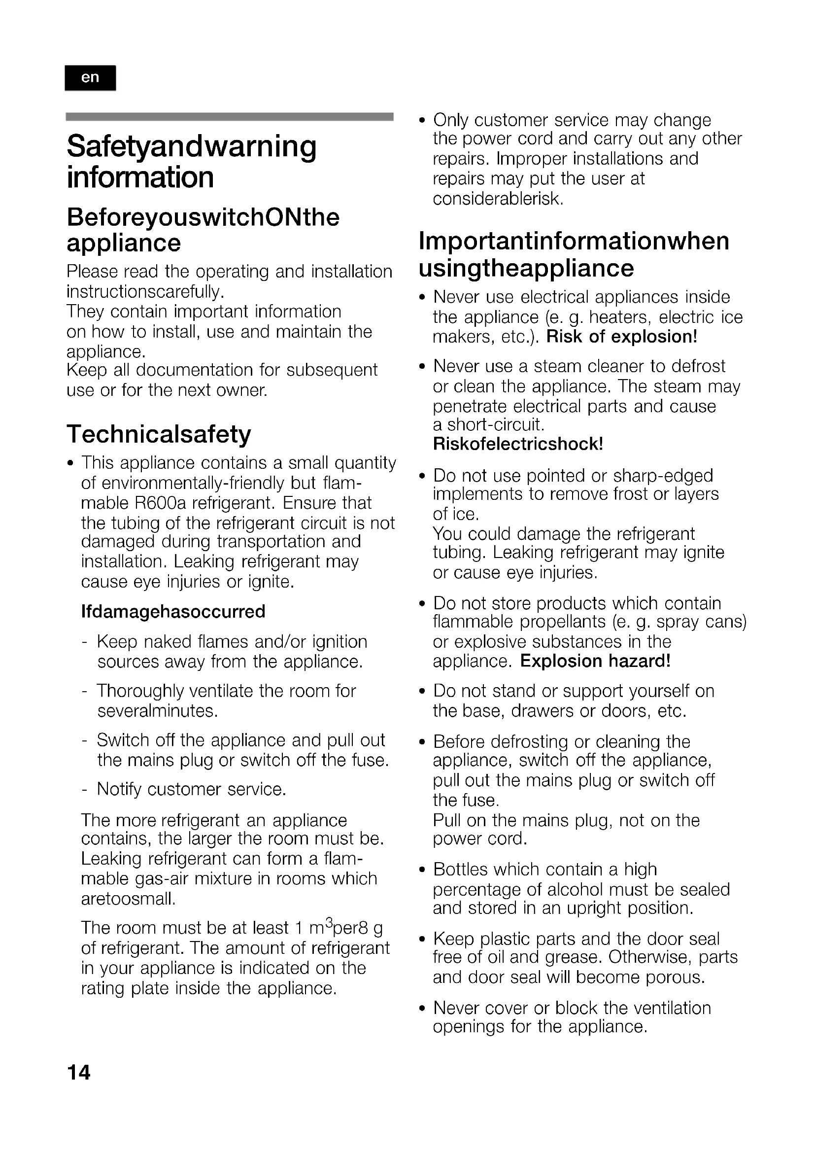 per 8g of refrigerant. The amount of refrigerant in your appliance is indicated on the rating plate inside the appliance. S Only customer service may change thepower cord and carry out any other repairs. Improper installations and repairs may put the user at considerable risk. Important information when using the appliance S Never use electrical appliances inside the appliance (e.g.heaters, electric ice makers, etc.). Risk of explosion! S Never use a steam cleaner to defrost orclean the appliance. The steam may penetrate electrical parts and cause ashortcircuit. Risk of electric shock! S Do not use pointed or sharpedged implements to remove frost or layers ofice. You could damage the refrigerant tubing. Leaking refrigerant may ignite orcause eye injuries. S Do not store products which contain flammable propellants (e.g.spray cans) or explosive substances in the appliance. Explosion hazard! S Do not stand or support yourself on thebase, drawers or doors, etc. S Before defrosting or cleaning the appliance, switch off the appliance, pullout the mains plug or switch off thefuse. Pull on the mains plug, not onthe power cord. S Bottles which contain a high percentage of alcohol must be sealed and stored in an upright position. S Keep plastic parts and the door seal free of oil and grease. Otherwise, parts and door seal will become porous. S Never cover or block the ventilation openings for the appliance. en15 S People who have limited physical, sensoryor mental abilities or inadequate knowledge must not use this appliance unless they are supervised or given meticulous instructions. Children in the household S Keep children away from packaging and its parts. Danger of suffocation from folding cartons and plastic film! S Do not allow children to play with the appliance! S If the appliance features a lock, keep the key out of the reach of children. General requirements This appliance is only intended for the storage of wine. This appliance is intended for domestic use in private households and for a domestic environment. The appliance has been interference−suppressed in compliance with EU Directive 2004/108/EC. The refrigerant circuit has been tested for leaks. This product complies with the relevant safety regulations for electrical appliances (EN60335/2/24). Information concerning disposal x Disposal of packaging The packaging protects your appliance from damage during transit. All packaging materials are environmentally friendly and recyclable. Please contribute to a better environment by disposing of packaging materials in an environmentallyfriendly manner. Please ask your dealer or inquire at your local authority about current means of disposal. x Disposal of your old appliance Old appliances are not worthless rubbish! Valuable raw materials can be reclaimed by recycling old appliances. This appliance is labelled in accordance with European Directive 2002/96/EG concerning used electrical and electronic appliances (waste electrical and electronic equipment WEEE). The guideline determines the framework for the return and recycling of used appliances as applicable throughout the EU.