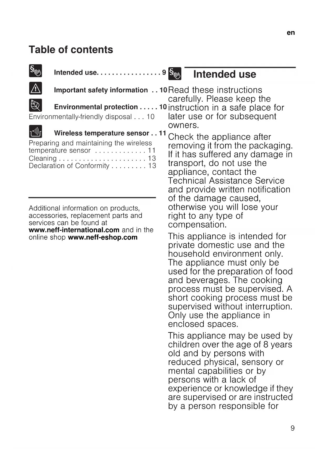 - Declaration of Conformity Produktinfo Additional information on products, accessories, replacement parts and services can be found at www.neff-international.com and in the online shop www.neff-eshop.com 8 Intended use Intended use Read these instructions carefully. Please keep the instruction in a safe place for later use or for subsequent owners. Check the appliance after removing it from the packaging. If it has suffered any damage in transport, do not use the appliance, contact the Technical Assistance Service and provide written notification of the damage caused, otherwise you will lose your right to any type of compensation. This appliance is intended for private domestic use and the household environment only. The appliance must only be used for the preparation of food and beverages. The cooking process must be supervised. A short cooking process must be supervised without interruption. Only use the appliance in enclosed spaces. This appliance may be used by children over the age of 8 years old and by persons with reduced physical, sensory or mental capabilities or by persons with a lack of experience or knowledge if they are supervised or are instructed by a person responsible foren p. 13