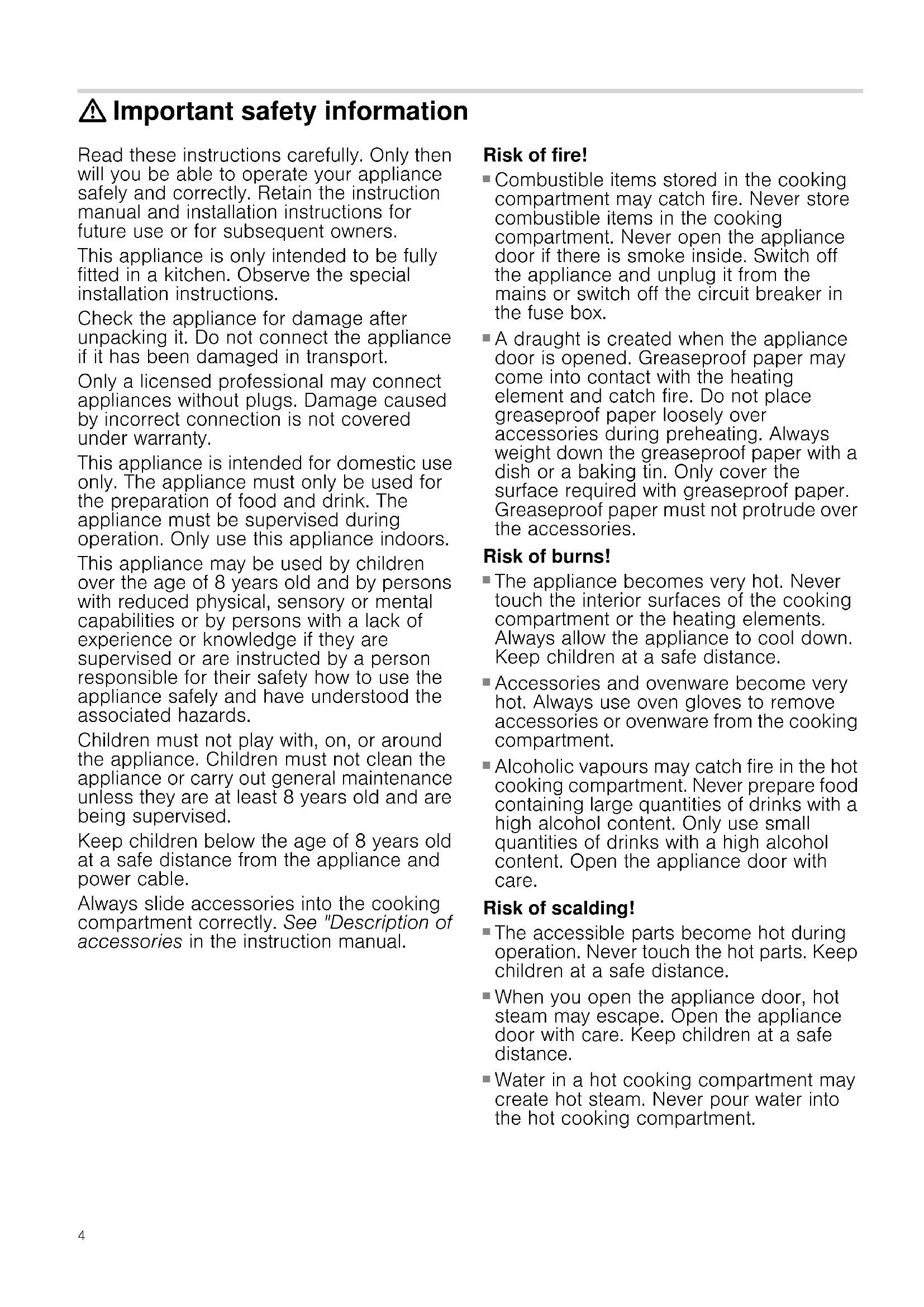Water in a hot cooking compartment may create hot steam. Never pour water into the hot cooking compartment.5 Risk of injury! Scratched glass in the appliance door may develop into a crack. Do not use a glass scraper, sharp or abrasive cleaning aids or detergents. Risk of electric shock!