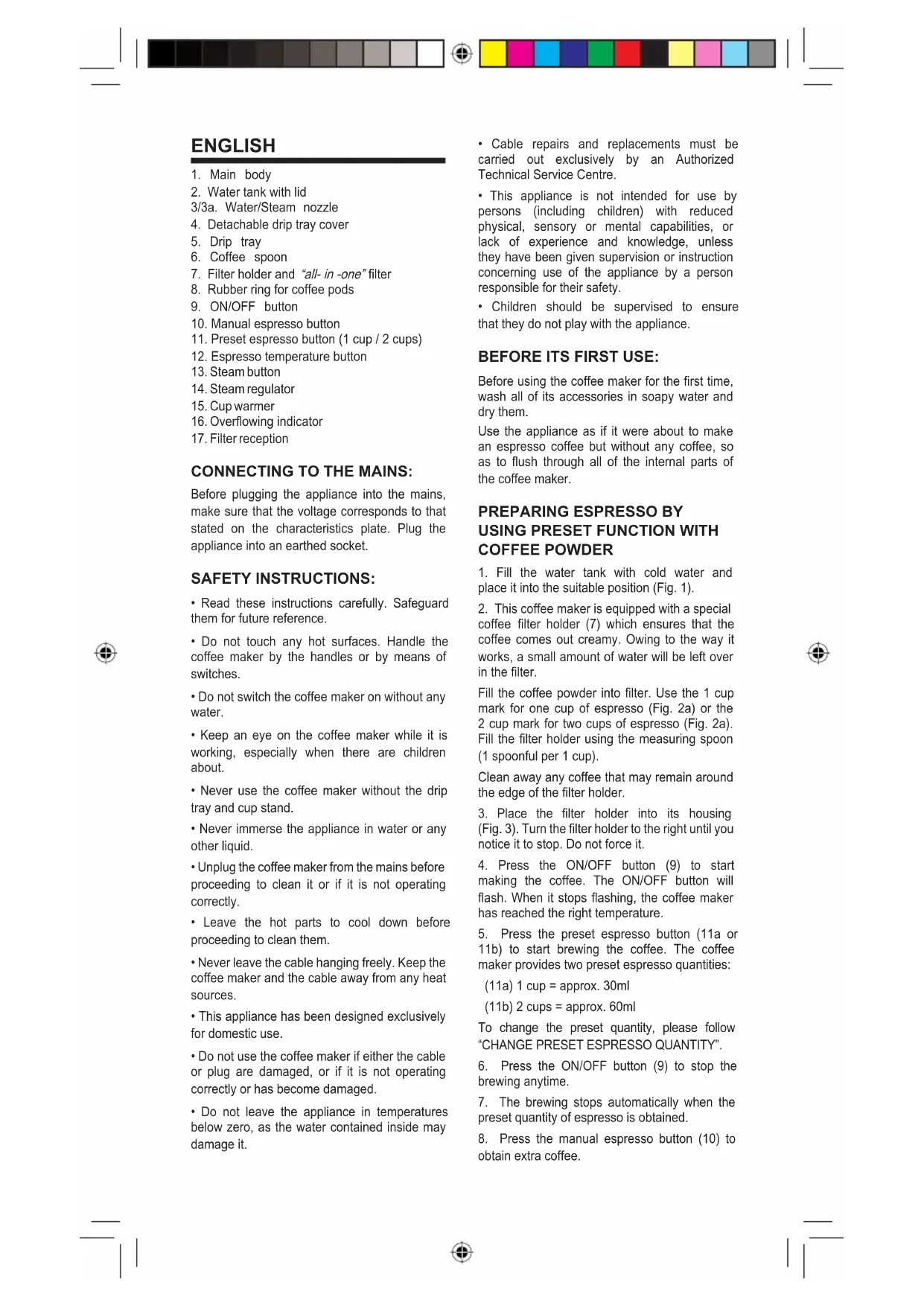 press the manual espresso button (10). Then turn the steam regulator (14) on so that hot water comes through the steam nozzle. CLEANING & MAINTENANCE Make sure that the coffee maker is unplugged and cold before attempting to clean it. The detachable parts can be washed in soapy water. Do not immerse the coffee maker in water or any other liquid. With a damp cloth periodically clean out the area where the filter holder sits, so as to remove any coffee that may have become stuck to it. Be careful when removing the filter holder as there may be hot water left inside it. In order to prolong the life of the machine, do not refit the filter holder if the coffee maker is going to be stored away for prolonged periods. Do not clean any of the parts in the dishwasher. DESCALING The coffee maker should be descaled regularly. To do this, fill the tank with a mix of three parts water to one part vinegar. Operate the appliance for two cycles, including the steam pipe. Following this, and to flush out any traces of vinegar, operate the coffee maker for a further two cycles but with water only. In order to obtain optimal results, it is also possible to add descaling liquid instead of vinegar into the water tank of the machine. To clean the coffee maker with this descaling liquid you must read carefully the instructions given by the manufacturer of the descaling product.