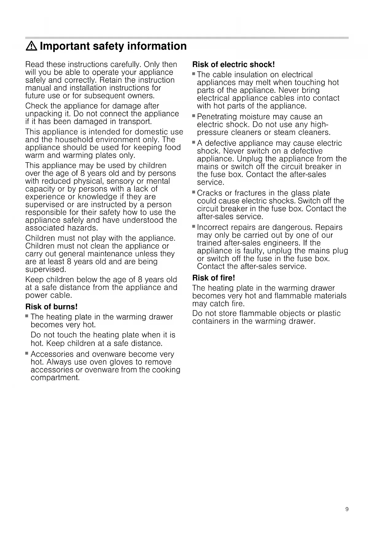 A defective appliance may cause electric shock. Never switch on a defective appliance. Unplug the appliance from the mains or switch off the circuit breaker in the fuse box. Contact the after-sales service. Risk of e lec tric shock!