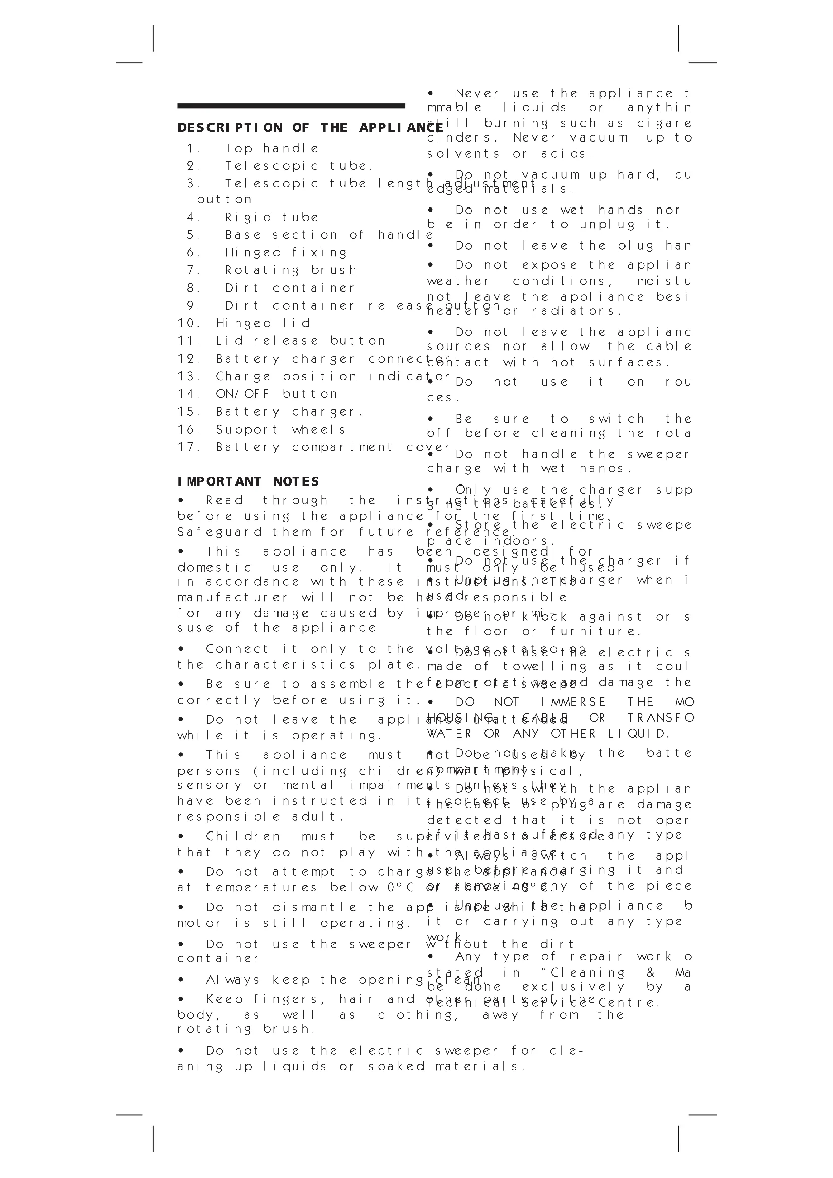 Charge up the vacuum cleaner’s batteries for approximately 16 hours before using it for the first time. Figure 6. Insert the charger jack (15) into the battery charger (12) on the appliance. The charge indicator (13) will light up. This indicator will remain lit as long as the va- cuum cleaner is plugged in, even if the battery is fully charged. The vacuum clea- ner will become warm while it is charging. This is quite normal and will not interfere with the appliance’s safety or operation. The vacuum cleaner can always be left to charge when it is not in use. This will ensure that the battery is always fully charged and ready for use. IMPORTANT: Please make sure that the va- cuum cleaner must be switched off before charging it. OPERATING INSTRUCTIONS Figure 7. Unlock the handle from the sto- rage position by placing your foot on the base of the sweeper to stop it from moving and then pull the handle back. Figure 8. Press the On/Off button (14) with your foot. Figure 9. Move the sweeper backwards and forwards at normal speed. When finished, switch off the sweeper by pressing the On/Off button (14) again. Figure 10. The sweeper can also be used as a hand-held appliance, to do this remo- ve the handle and hold the sweeper by the base section of the handle. After each use, empty the dirt container (8), see section entitled “Cleaning and mainte- nance”. Recharge the batteries after each use, do not wait the batteries are completely drained. See section referring to “Battery Charging”. CLEANING & MAINTENANCE If the appliance is being charged, unplug the appliance before cleaning it or carrying out any type of maintenance work. Make sure that the appliance is switch off. Never wash the appliance or any of its pieces under running water or in the dis- hwasher. Clean the appliance with a soft, damp clo- th. Do not use abrasive products to clean the appliance. To remove the dirt container: Empty the dirt container after each use. Figure 11. To remove the dirt container, press the release button (9) and lift the container upward. Figure 12. To empty the container, place the dirt container over a dustbin and press the release button (11) to open the folding lid on the base. Fit the container back into the appliance, if you find it difficult to slot it back in, make sure there are no small pieces of metal such as staples or paper clips, etc., attached magnetically to the motor, which is located on the underside of the base. If there are, clean them off and try to fit it in again. Cleaning the wheels and the rotating brush: After each use, dirt may have become atta- ched to the wheels or rotating brush. Hair, thread and other such particles are prone to become caught up in these areas. Carefully clean the brush and the wheels, if necessary use scissors to cut away tangled hairs and threads.METHOD FOR REMOVING THE BATTERIES: