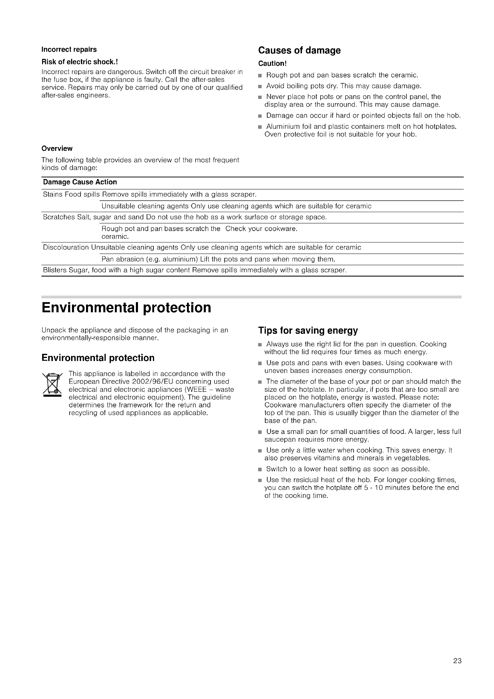 The setting is activated. Switching off To exit the basic setting, switch off the hob with the main switch and make new settings. Cleaning and care The information in this section provides help on how best to care for your hob. Suitable maintenance and cleaning products can be purchased from the after-sales service or in our e-Shop. Ceramic Clean the hob after each use. This will prevent spills from burning onto the ceramic. Only clean the hob when it has cooled down sufficiently. Use only cleaning agents which are suitable for ceramic. Follow the cleaning instructions on the packaging. Never use: ■ Undiluted washing-up liquid ■ Detergent intended for dishwashers ■ Scouring agents ■ Harsh cleaning agents such as oven spray or stain remover ■ Abrasive sponges ■ High-pressure cleaners or steam jet cleaners Ground-in dirt can be best removed with a glass scraper, available from retailers. Please note the manufacturer's instructions. You can also obtain a suitable glass scraper from our after- sales service or from the e-Shop. Hob surround To prevent damage to the hob surround, please observe the following instructions: ■ Use only warm, soapy water. ■ Do not use harsh or abrasive agents. ■ Do not use the glass scraper. Twist knob It is recommended that the touch knob is wiped with lukewarm soapy water only. Do not use harsh or abrasive agents. The twist knob will be damaged if cleaned in the dishwasher or immersed in soapy water. ™ˆ Activation of the filament circuits ‹ Switched off.* ‚ Switched on. ƒ Last setting before the hotplate was switched off. ™‰ Operation without twist knob ‹ Switched off ‚ Switched on* ™‹ Reset to basic setting ‹ Switched off. ‚ Switched on. Indicator Function *Basic setting30 Rectifying faults Malfunctions often have simple explanations. Please read the following notes before calling the after-sales service. After-sales service Our after-sales service is there for you if your appliance should need to be repaired. We are committed fo find the best solution also in order to avoid an unnecessary call-out. E number and FD number: Please quote the E number (product number) and the FD number (production number) of your appliance when contacting the after-sales service. The rating plate bearing these numbers can be found on the appliance certificate. Please note that a visit from an after-sales service engineer is not free of charge, even during the warranty period. Please find the contact data of all countries in the enclosed customer service list. To book an engineer visit and product advice Trust the expertise of the manufacturer, and rest assured that the repair will be carried out by trained service technicians using original spare parts for your domestic appliance. Indicator Fault Action Blank There is no power supply. Check the household fuse for the appliance. Check whether there is a power cut by trying other electronic appliances. “ is flash- ing The controls are damp or an object is resting on them. Dry the controls or remove the object. “§„‰ Twist knob not centred in the twistpad. Place the twist knob in the centre of the twistpad.