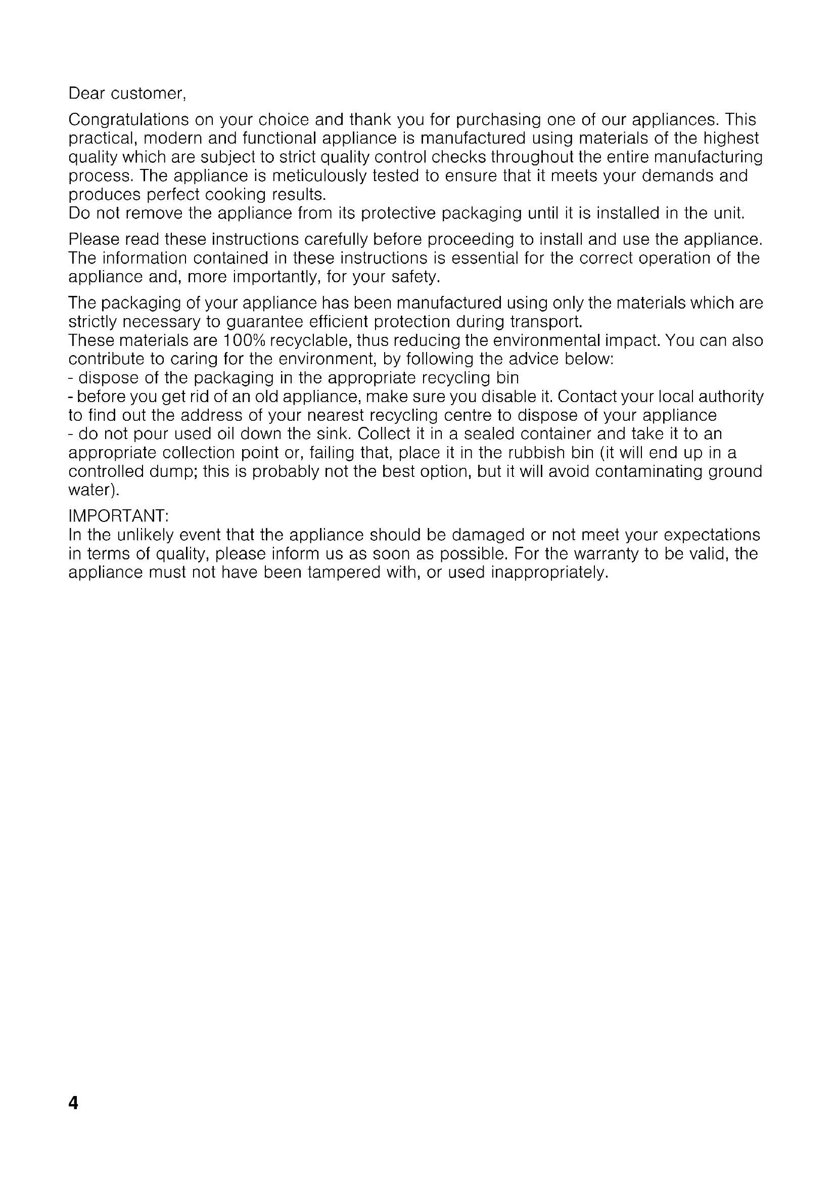 - Environmentally-friendly waste management Dear customer, Congratulations on your choice and thank you for purchasing one of our appliances. This practical, modern and functional appliance is manufactured using materials of the highest quality which are subject to strict quality control checks throughout the entire manufacturing process. The appliance is meticulously tested to ensure that it meets your demands and produces perfect cooking results. Do not remove the appliance from its protective packaging until it is installed in the unit. Please read these instructions carefully before proceeding to install and use the appliance. The information contained in these instructions is essential for the correct operation of the appliance and, more importantly, for your safety. The packaging of your appliance has been manufactured using only the materials which are strictly necessary to guarantee efficient protection during transport. These materials are 100% recyclable, thus reducing the environmental impact. You can also contribute to caring for the environment, by following the advice below: - dispose of the packaging in the appropriate recycling bin - before you get rid of an old appliance, make sure you disable it. Contact your local authority to find out the address of your nearest recycling centre to dispose of your appliance - do not pour used oil down the sink. Collect it in a sealed container and take it to an appropriate collection point or, failing that, place it in the rubbish bin (it will end up in a controlled dump; this is probably not the best option, but it will avoid contaminating ground water). IMPORTANT: In the unlikely event that the appliance should be damaged or not meet your expectations in terms of quality, please inform us as soon as possible. For the warranty to be valid, the appliance must not have been tampered with, or used inappropriately.5 Safety precautions Read these instructions carefully. Reading these instructions will enable you to use your appliance safely and effectively. All operations relating to installation, regulation and conversion to other types of gas must be carried out by an authorised installation engineer, respecting applicable regulations, standards and the specifications of the local gas and electricity providers. You are recommended to contact the Technical Assistance Service to convert to another type of gas. Before installing your new hob, ensure that it is being installed according to the assembly instructions. This appliance can only be installed in a well-ventilated place in accordance with existing regulations and ventilation specifications. The appliance must not be connected to a combustion product removal device. This appliance has been designed for home use only, not for commercial or professional use. This appliance cannot be installed on yachts or in caravans. The warranty will only be valid if the appliance is used for the purpose for which it was designed. The place in which the appliance is installed must have fully-functioning ventilation, in accordance with the regulations. Do not subject the appliance to draughts. These might blow out the burners. This appliance leaves the factory set to the type of gas that is indicated on the specifications plate. If this must be changed, read the Assembly instructions. Do not tamper with the appliance's interior. If necessary, call our Technical Assistance Service. These operating and installation instructions should be retained, and passed onto the buyer if the appliance is sold. Do not switch on the appliance if it is damaged in any way. Contact our Technical Assistance Service. The surfaces of cooking appliances heat up during use. Care must be taken when using these appliances. Keep children well away from this appliance. This appliance is only intended for cooking purposes, not as a heating system.6 Fat or oil which is overheated can catch fire easily. Do not leave oil or fats to heat up unattended. If oil or fats do catch fire, never use water to put the fire out. Risk of burns! Put the fire out by covering the pan with a lid and switch off the hotplate. In the event of a malfunction, turn off the appliance’s gas and electricity supply. For repairs, call our Technical Assistance Service. If one of the control knobs will not turn, do not force it. Call the Technical Assistance Service immediately, so that they can repair or replace it. Never place unstable pans on the hob or the burners, as they may accidentally tip over. Do not clean the hob using a steam cleaner. Risk of electrocution! This appliance is class 3 type, according to the EN 30-1- 1 standard for gas appliances: built-in appliance. Do not store or use corrosive chemicals, steamers, flammable materials or non-food products below or near this domestic appliance. This appliance is not intended for use by persons (including children) with reduced physical, sensory or mental capabilities, or lack of experience and knowledge, unless they have been given supervision or instruction concerning use of the appliance by a person responsible for their safety. Never leave the appliance unattended during operation. The graphics in this instruction manual are given as a guide only. The manufacturer is exempt from all responsibility if the requirements of this manual are not complied with.7 Your new appliance Pan support Control knob Burner (up to 3 kW) Burner (up to p. 154