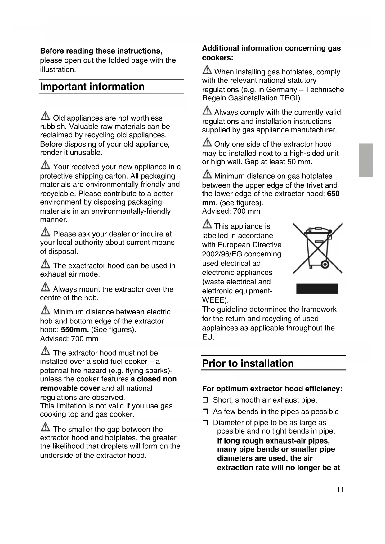 Before reading these instructions, please open out the folded page with the illustration. Important information Old appliances are not worthless rubbish. Valuable raw materials can be reclaimed by recycling old appliances. Before disposing of your old appliance, render it unusable. Your received your new appliance in a protective shipping carton. All packaging materials are environmentally friendly and recyclable. Please contribute to a better environment by disposing packaging materials in an environmentally-friendly manner. Please ask your dealer or inquire at your local authority about current means of disposal. The exactractor hood can be used in exhaust air mode. Always mount the extractor over the centre of the hob. Minimum distance between electric hob and bottom edge of the extractor hood: 550mm. (See figures). Advised: 700 mm The extractor hood must not be installed over a solid fuel cooker – a potential fire hazard (e.g. flying sparks)- unless the cooker features a closed non removable cover and all national regulations are observed. This limitation is not valid if you use gas cooking top and gas cooker. The smaller the gap between the extractor hood and hotplates, the greater the likelihood that droplets will form on the underside of the extractor hood. Additional information concerning gas cookers: When installing gas hotplates, comply with the relevant national statutory regulations (e.g. in Germany – Technische Regeln Gasinstallation TRGI). Always comply with the currently valid regulations and installation instructions supplied by gas appliance manufacturer. Only one side of the extractor hood may be installed next to a high-sided unit or high wall. Gap at least 50 mm. Minimum distance on gas hotplates between the upper edge of the trivet and the lower edge of the extractor hood: 650 mm. (see figures). Advised: 700 mm This appliance is labelled in accordane with European Directive 2002/96/EG concerning used electrical ad electronic appliances (waste electrical and elettronic equipment- WEEE). The guideline determines the framework for the return and recycling of used applainces as applicable throughout the EU. Prior to installation For optimum extractor hood efficiency: Short, smooth air exhaust pipe. As few bends in the pipes as possible Diameter of pipe to be as large as possible and no tight bends in pipe. If long rough exhaust-air pipes, many pipe bends or smaller pipe diameters are used, the air extraction rate will no longer be at12