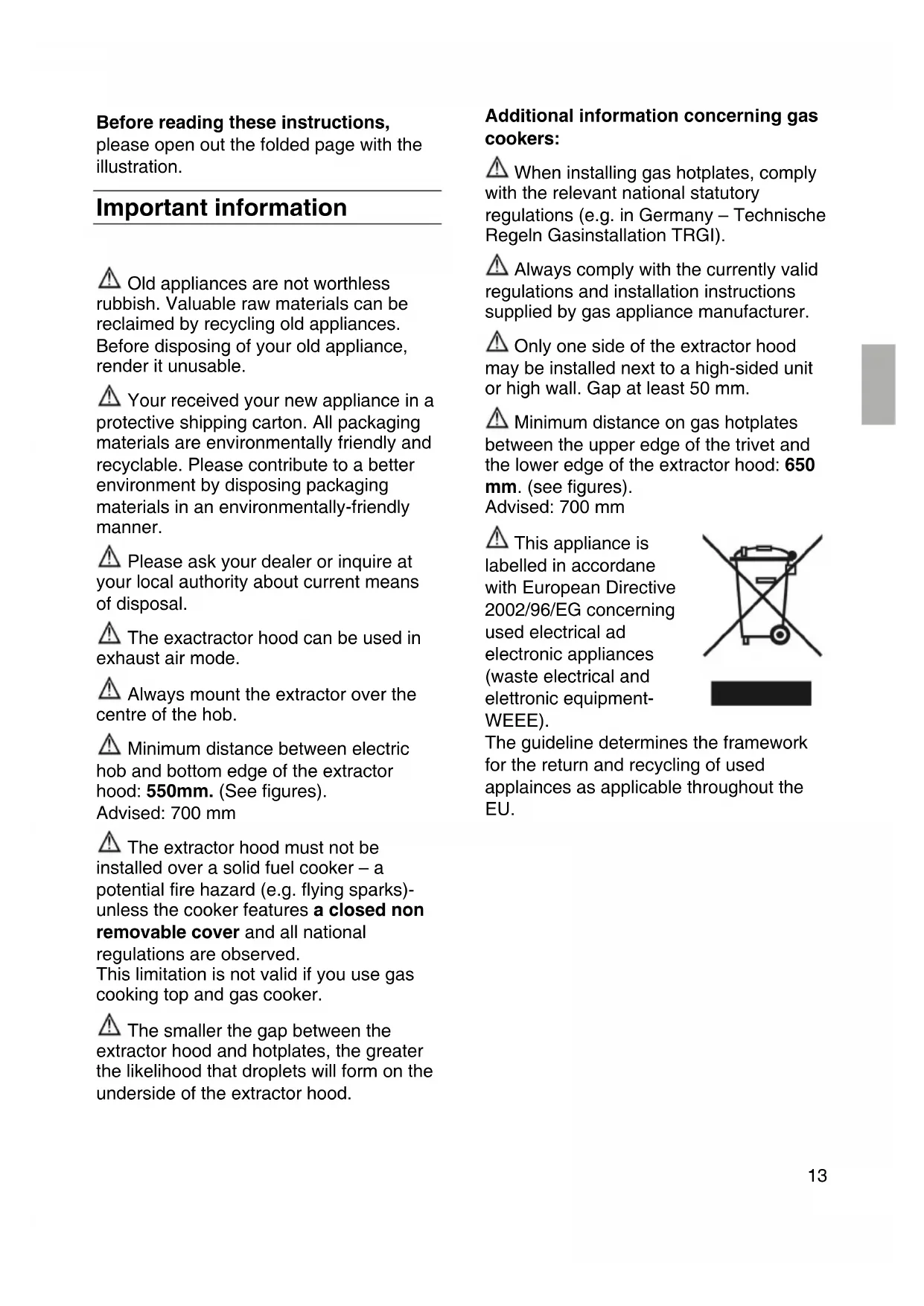 Before reading these instructions, please open out the folded page with the illustration. Important information Old appliances are not worthless rubbish. Valuable raw materials can be reclaimed by recycling old appliances. Before disposing of your old appliance, render it unusable. Your received your new appliance in a protective shipping carton. All packaging materials are environmentally friendly and recyclable. Please contribute to a better environment by disposing packaging materials in an environmentally-friendly manner. Please ask your dealer or inquire at your local authority about current means of disposal. The exactractor hood can be used in exhaust air mode. Always mount the extractor over the centre of the hob. Minimum distance between electric hob and bottom edge of the extractor hood: 550mm. (See figures). Advised: 700 mm The extractor hood must not be installed over a solid fuel cooker – a potential fire hazard (e.g. flying sparks)- unless the cooker features a closed non removable cover and all national regulations are observed. This limitation is not valid if you use gas cooking top and gas cooker. The smaller the gap between the extractor hood and hotplates, the greater the likelihood that droplets will form on the underside of the extractor hood. Additional information concerning gas cookers: When installing gas hotplates, comply with the relevant national statutory regulations (e.g. in Germany – Technische Regeln Gasinstallation TRGI). Always comply with the currently valid regulations and installation instructions supplied by gas appliance manufacturer. Only one side of the extractor hood may be installed next to a high-sided unit or high wall. Gap at least 50 mm. Minimum distance on gas hotplates between the upper edge of the trivet and the lower edge of the extractor hood: 650 mm. (see figures). Advised: 700 mm This appliance is labelled in accordane with European Directive 2002/96/EG concerning used electrical ad electronic appliances (waste electrical and elettronic equipment- WEEE). The guideline determines the framework for the return and recycling of used applainces as applicable throughout the EU.14