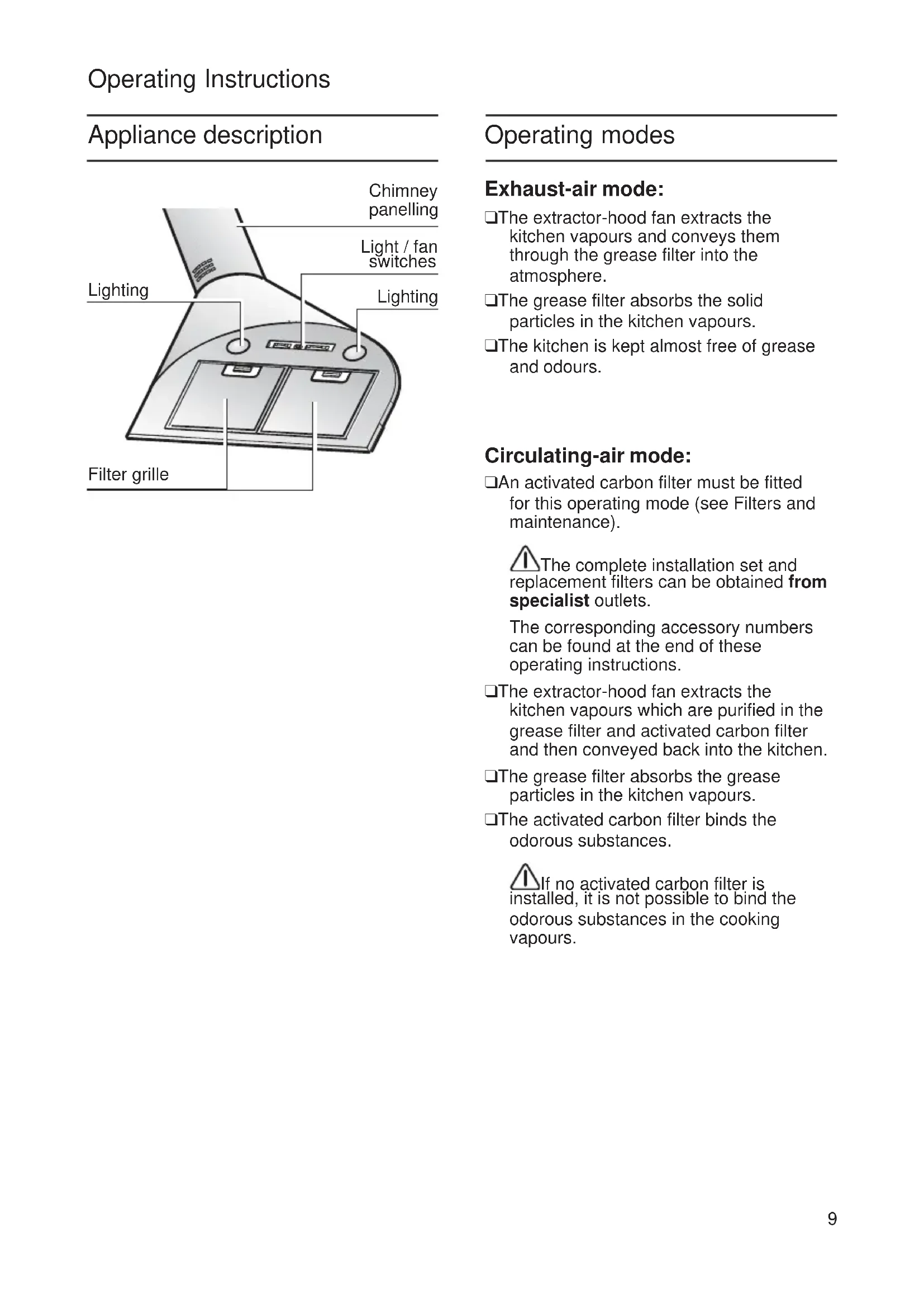 Netzsteckers oder durch Einschalten der Sicherung die Stromversorgung wieder her. Störungen Bei eventuellen Rückfragen oder Störungen, Kundendienst anrufen. (Siehe Kundendienststellenverzeichnis). Bei Anruf bitte angeben: E-Nr. FD Tragen Sie die Nummern in obige Felder ein. Die Nummern sind auf dem Typenschild, nach Abnahme der Fettfilter, im Innenraum der Dunstabzugshaube zu finden.9 Operating Instructions Operating modes Exhaust-air mode: ❑ The extractor-hood fan extracts the kitchen vapours and conveys them through the grease filter into the atmosphere. ❑ The grease filter absorbs the solid particles in the kitchen vapours. ❑ The kitchen is kept almost free of grease and odours. Circulating-air mode: ❑ An activated carbon filter must be fitted for this operating mode (see Filters and maintenance). The complete installation set and replacement filters can be obtained from specialist outlets. The corresponding accessory numbers can be found at the end of these operating instructions. ❑ The extractor-hood fan extracts the kitchen vapours which are purified in the grease filter and activated carbon filter and then conveyed back into the kitchen. ❑ The grease filter absorbs the grease particles in the kitchen vapours. ❑ The activated carbon filter binds the odorous substances. If no activated carbon filter is installed, it is not possible to bind the odorous substances in the cooking vapours. Chimney panelling Light / fan switches Lighting Lighting Filter grille Appliance description10 Before using for the first time Important notes: ❑ The Instructions for Use apply to several versions of this appliance. Accordingly, you may find descriptions of individual features that do not apply to your specific appliance. ❑ This extractor hood complies with all relevant safety regulations. Repairs should be carried out by qualified technicians only. Improper repairs may put the user at considerable risk. ❑ Before using your appliance for the first time, please read these Instructions for Use carefully. They contain important information concerning your personal safety as well as on use and care of the appliance. ❑ Please retain the operating and installation instructions for a subsequent owner. Dispose of packaging materials properly (see Installation instructions). This extractor hood is designed for domestic use only. Before any cleaning or maintenance operation, disconnect the hood from the mains by removing the plug or disconnecting the home mains switch. The appliance is not intended for use by children or persons with impaired physical, sensorial or mental faculties, or if lacking in experience or know-how, unless they are under supervision or have been trained in the use of the appliance by a person responsible for their safety. Children should be monitored to ensure that they do not play with the appliance. Never use the hood without effectively mounted grating.! The hood must NEVER be used as a support surface unless specifically indicated. The premises must be sufficiently ventilated, when the kitchen hood is used together with other gas combustion devices or other fuels. The suctioned air must not be conveyed into a conduit used for the disposal of the fumes generated by appliances that combust gases or other fuels. The flaming of foods beneath the hood itself is severely prohibited. The use of exposed flames is detrimental to the filters and may cause a fire risk, and must therefore be avoided in all circumstances. Any frying must be done with care in order to make sure that the oil does not overheat and burst into flames. As regards the technical and safety measures to be adopted for fume discharging it is important to closely follow the relations provided by the competent authorities. The hood must be regularly cleaned on both the inside and outside (AT LEAST ONCE A MONTH, it is in any event necessary to proceed in accordance with the maintenance instructions provided in this manual).. Failure to follow the instructions as concerns hood and filter cleaning will lead to the risk of fires.11 Gas stoves and electric stoves Do not use a gas hob with all the stoves on and top-powered for more than 15 minutes, otherwise the surface of the cooker hood might risk overheating, thus causing burns in case of contact with the hood. Furthermore the cooker hood might get damaged. In case more than 3 gas stoves are used, the cooker hood must be used at top power. ❑ Important: a big stove having power higher than 5 KW (type WOK) corresponds to 2 standard stoves. ❑ Never use the gas stoves without any pots. Adjust the flame so that it does not exceed the perimeter of the pot. Do not use or leave the hood without the lamp correctly mounted because of the possible risk of electric shocks. We decline any responsibility for any problems, damage or fires caused to the appliance as the result of the non- observance of the instructions included in this manual.12 Operating procedure The most effective method of removing vapours produced during cooking is to: ❑ Switch the ventilator ON as soon as you begin cooking. ❑ Switch the ventilator OFF a few minutes after you have finished cooking. Switching ON: ❑ Slide the right slide switch to the desired fan setting. Switching OFF: ❑ Slide the right slide switch back to 0. Lighting: ❑ The light can be switched on at any time, even though the fan is switched off. Filters and maintenance ATTENTION! Before performing any maintenance operation, isolate the hood from the electrical supply by switching off at the connector and removing the connector fuse. Or if the appliance has been connected through a plug and socket, then the plug must be removed from the socket. Grease filters: Metal filters are used to trap the greasy element of the vapours that develop during cooking. The filter mats are made from noncombustible metal. Caution: As the filter becomes more and more saturated with grease, not only does the risk of it catching fire inc