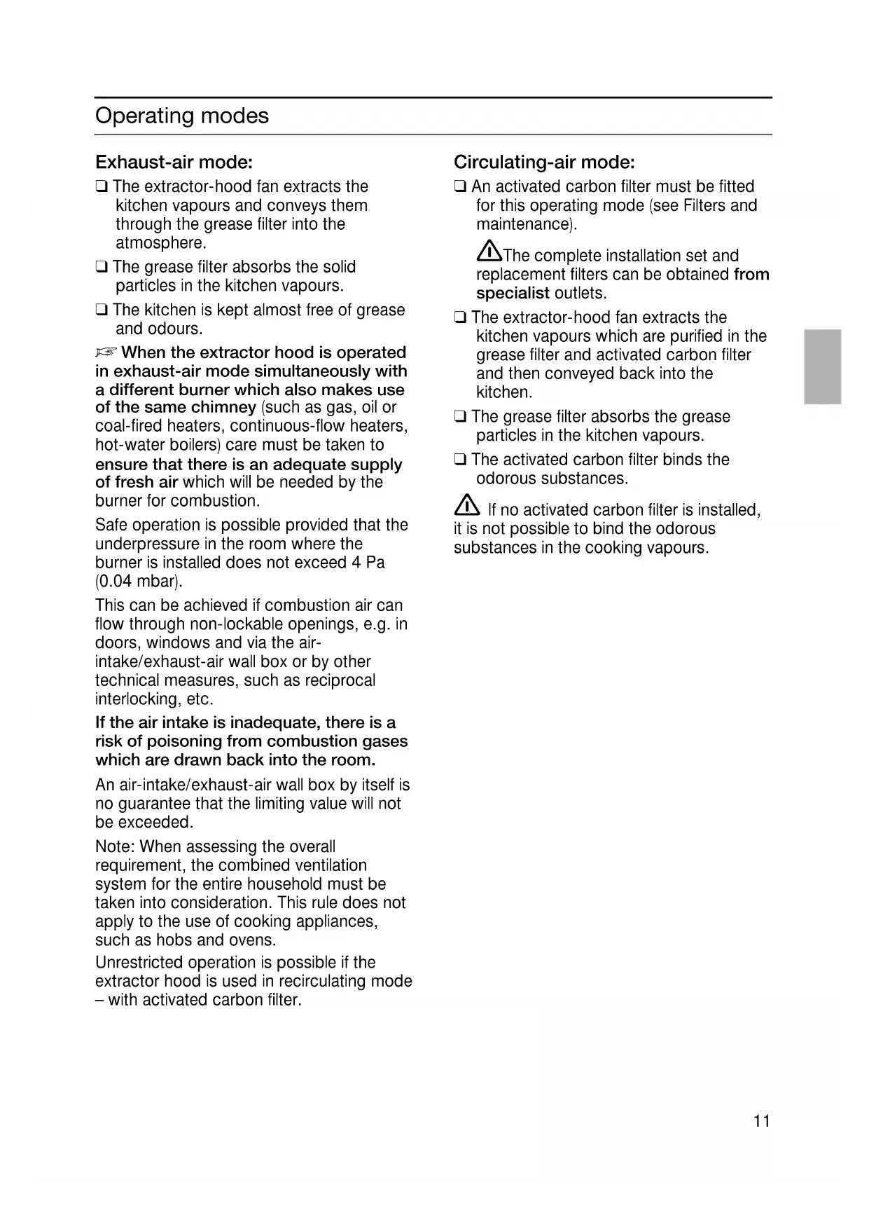 When the extractor hood is operated in exhaust-air mode simultaneously with a different burner which also makes use of the same chimney (such as gas, oil or coal-fired heaters, continuous-flow heaters, hot-water boilers) care must be taken to ensure that there is an adequate supply of fresh air which will be needed by the burner for combustion. Safe operation is possible provided that the underpressure in the room where the burner is installed does not exceed 4 Pa (0.04 mbar). This can be achieved if combustion air can flow through non-lockable openings, e.g. in doors, windows and via the air- intake/exhaust-air wall box or by other technical measures, such as reciprocal interlocking, etc. If the air intake is inadequate, there is a risk of poisoning from combustion gases which are drawn back into the room. An air-intake/exhaust-air wall box by itself is no guarantee that the limiting value will not be exceeded. Note: When assessing the overall requirement, the combined ventilation system for the entire household must be taken into consideration. This rule does not apply to the use of cooking appliances, such as hobs and ovens. Unrestricted operation is possible if the extractor hood is used in recirculating mode – with activated carbon filter. Operating modes Circulating-air mode: ❑ An activated carbon filter must be fitted for this operating mode (see Filters and maintenance). The complete installation set and replacement filters can be obtained from specialist outlets. ❑ The extractor-hood fan extracts the kitchen vapours which are purified in the grease filter and activated carbon filter and then conveyed back into the kitchen. ❑ The grease filter absorbs the grease particles in the kitchen vapours. ❑ The activated carbon filter binds the odorous substances. If no activated carbon filter is installed, it is not possible to bind the odorous substances in the cooking vapours.12 Before using for the first time Important notes: ❑ The Instructions for Use apply to several versions of this appliance. Accordingly, you may find descriptions of individual features that do not apply to your specific appliance. ❑ This extractor hood complies with all relevant safety regulations. Repairs should be carried out by qualified technicians only. Improper repairs may put the user at considerable risk. ❑ Before using your appliance for the first time, please read these Instructions for Use carefully. They contain important information concerning your personal safety as well as on use and care of the appliance. ❑ Please retain the operating and installation instructions for a subsequent owner. Gas hobs / Gas cookers Do not use all the gas hotplates simultaneously for a prolonged period (max. 15 minutes) at maximum thermal load, otherwise there is a risk of burns if the housing surfaces are touched or a risk of damage to the extractor hood. If the extractor hood is situated over a gas hob, operate the hood at maximum setting if three or more gas hotplates are operated simultaneously. ❑ This appliance is labelled in accordance with European Directive 2002/96/EG concerning used electrical and electronic appliances (waste electrical and electronic equipment – WEEE). The guideline determines the framework for the return and recycling of used appliances as applicable throughout the EU.