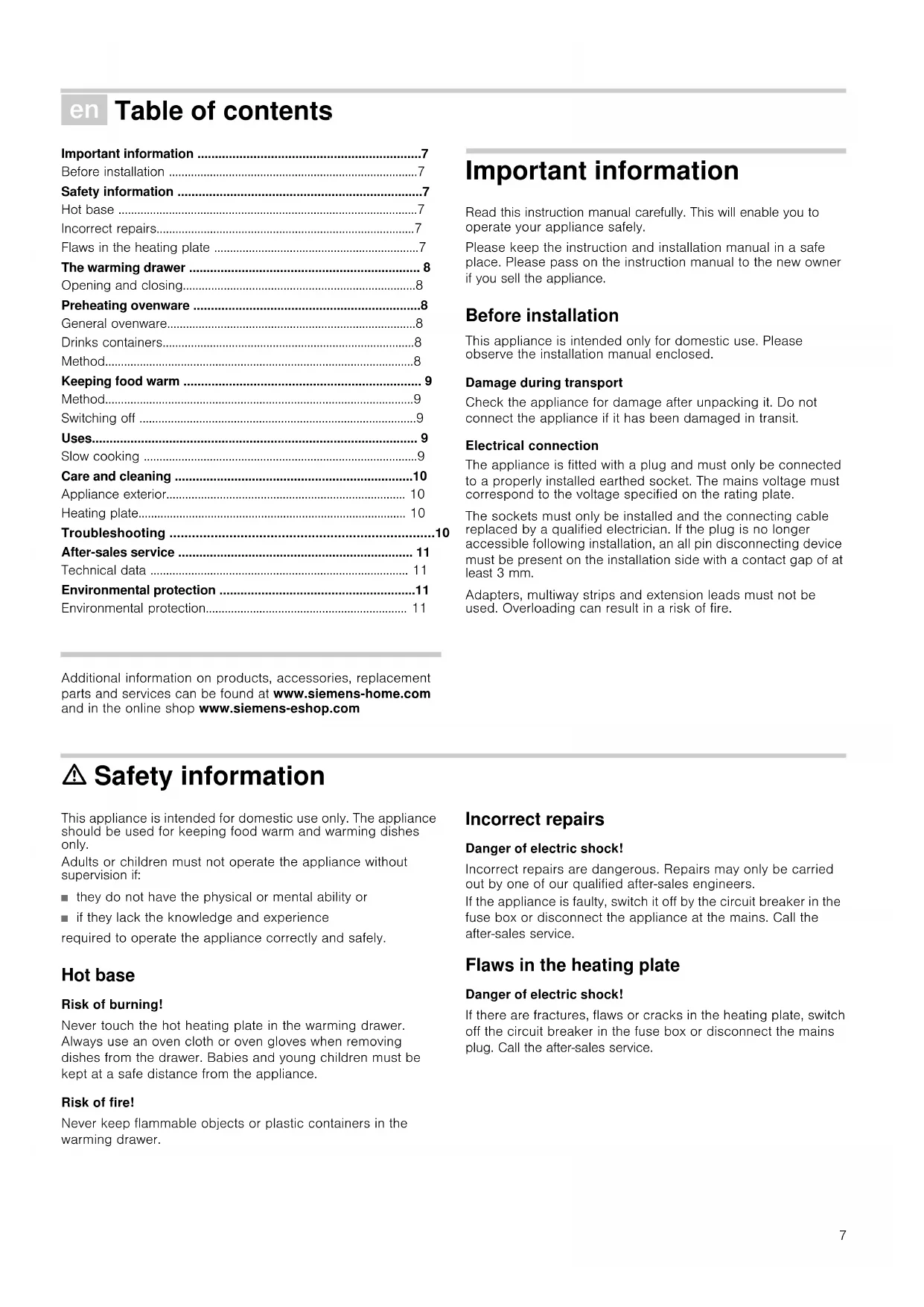 - Environmental protection Produktinfo Additional information on products, accessories, replacement parts and services can be found at www.siemens-home.com and in the online shop www.siemens-eshop.com Important information Read this instruction manual carefully. This will enable you to operate your appliance safely. Please keep the instruction and installation manual in a safe place. Please pass on the instruction manual to the new owner if you sell the appliance. Before installation This appliance is intended only for domestic use. Please observe the installation manual enclosed. Damage during transport Check the appliance for damage after unpacking it. Do not connect the appliance if it has been damaged in transit. Electrical connection The appliance is fitted with a plug and must only be connected to a properly installed earthed socket. The mains voltage must correspond to the voltage specified on the rating plate. The sockets must only be installed and the connecting cable replaced by a qualified electrician. If the plug is no longer accessible following installation, an all pin disconnecting device must be present on the installation side with a contact gap of at least 3 mm. Adapters, multiway strips and extension leads must not be used. Overloading can result in a risk of fire. ã=Safety information This appliance is intended for domestic use only. The appliance should be used for keeping food warm and warming dishes only. Adults or children must not operate the appliance without supervision if: ■ they do not have the physical or mental ability or ■ if they lack the knowledge and experience required to operate the appliance correctly and safely. Hot base Risk of burning! Never touch the hot heating plate in the warming drawer. Always use an oven cloth or oven gloves when removing dishes from the drawer. Babies and young children must be kept at a safe distance from the appliance. Risk of fire! Never keep flammable objects or plastic containers in the warming drawer. Incorrect repairs Danger of electric shock! Incorrect repairs are dangerous. Repairs may only be carried out by one of our qualified after-sales engineers. If the appliance is faulty, switch it off by the circuit breaker in the fuse box or disconnect the appliance at the mains. Call the after-sales service. Flaws in the heating plate Danger of electric shock! If there are fractures, flaws or cracks in the heating plate, switch off the circuit breaker in the fuse box or disconnect the mains plug. Call the after-sales service.8 The warming drawer You can use the warming drawer to preheat ovenware or to keep food warm. The appliance will only heat up if the drawer is closed correctly. Opening and closing For appliances with no handle: Press the middle of the drawer to open or close it. When opening, the drawer pops out slightly. You can then pull it out towards you. Preheating ovenware Food stays warm for longer in preheated ovenware. Drinks also remain warm for longer. General ovenware Only load the warming drawer up to 25 kg. You can preheat dinnerware for 6 or 12 people, for example. Arranging ovenware As far as possible, distribute the ovenware over the entire surface. It takes longer to warm through tall stacks of plates than individual pieces of ovenware, e.g. 2 serving dishes. Drinks containers Always heat drinks containers, e.g. espresso cups, using setting 2. ã=Risk of burning! At setting 3 or 4, the drinks containers will get very hot. Method 1.Place the ovenware in the drawer.2.Set the function selector to setting 4. Always heat drinks containers using setting 2. The "power on" indicator light flashes. 3.Close the warming drawer. The "power on" indicator light lights up. The appliance heats up. How long does preheating take The length of time required for preheating depends on the material the ovenware is made of and its thickness, as well as the quantity, height and arrangement of the ovenware. As far as possible, distribute the ovenware over the entire surface. It takes approximately 15-25 minutes to preheat dinnerware for 6 people. Switching off Open the drawer. Switch off the function selector. Removing ovenware Remove ovenware from the drawer using oven gloves or an oven cloth. ã=Risk of burning! The upper surface of the heating plate will be hot. The base of the ovenware will be hotter than the top. 3RZHURQLQGLFDWRUOLJKW 7KHLQGLFDWRUOLJKWIODVKHVZKHQ \RXVZLWFKRQWKHDSSOLDQFH ,WOLJKWVXSZKHQWKHGUDZHU LVFORVHG )DQDQGKHDWHU UXQZKHQWKHSUHKHDW RYHQZDUHVHWWLQJLVVHOHFWHG +HDWLQJSODWH )XQFLRQVHOHFWRU 2II p. 11
