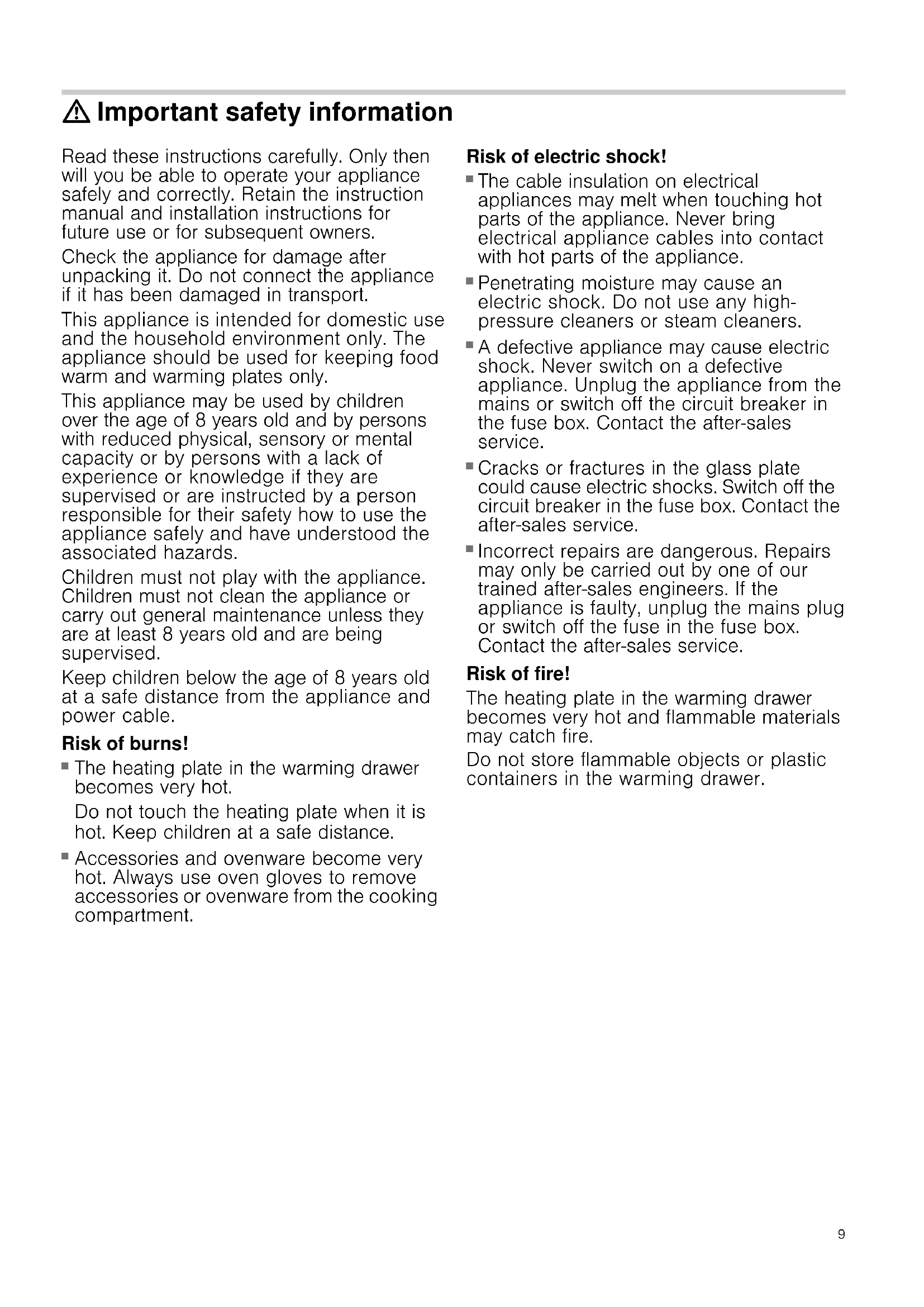 Incorrect repairs are dangerous. Repairs may only be carried out by one of our trained after-sales engineers. If the appliance is faulty, unplug the mains plug or switch off the fuse in the fuse box. Contact the after-sales service. Risk of fire! The heating plate in the warming drawer becomes very hot and flammable materials may catch fire. Do not store flammable objects or plastic containers in the warming drawer.10 The warming drawer You can use the warming drawer to preheat ovenware or to keep food warm. The appliance will only heat up if the drawer is closed correctly. Opening and closing For appliances with no handle: Press the middle of the drawer to open or close it. When opening, the drawer pops out slightly. You can then pull it out towards you. Preheating ovenware Food stays warm for longer in preheated ovenware. Drinks also remain warm for longer. General ovenware Only load the warming drawer up to 25 kg. You can preheat dinnerware for 6 or 12 people, for example. Arranging ovenware As far as possible, distribute the ovenware over the entire surface. It takes longer to warm through tall stacks of plates than individual pieces of ovenware, e.g. 2 serving dishes. Drinks containers Always heat drinks containers, e.g. espresso cups, using setting 2. : Risk of burning! At setting 3 or 4, the drinks containers will get very hot. Method 1.Place the ovenware in the drawer.2.Set the function selector to setting 4. Always heat drinks containers using setting 2. The "power on" indicator light flashes. 3.Close the warming drawer. The "power on" indicator light lights up. The appliance heats up. How long does preheating take The length of time required for preheating depends on the material the ovenware is made of and its thickness, as well as the quantity, height and arrangement of the ovenware. As far as possible, distribute the ovenware over the entire surface. It takes approximately 15-25 minutes to preheat dinnerware for 6 people. Switching off Open the drawer. Switch off the function selector. Removing ovenware Remove ovenware from the drawer using oven gloves or an oven cloth. : Risk of burning! The upper surface of the heating plate will be hot. The base of the ovenware will be hotter than the top. 3RZHURQLQGLFDWRUOLJKW 7KHLQGLFDWRUOLJKWIODVKHVZKHQ \RXVZLWFKRQWKHDSSOLDQFH ,WOLJKWVXSZKHQWKHGUDZHU LVFORVHG )DQDQGKHDWHU UXQZKHQWKHSUHKHDW RYHQZDUHVHWWLQJLVVHOHFWHG +HDWLQJSODWH )XQFLRQVHOHFWRU 2II