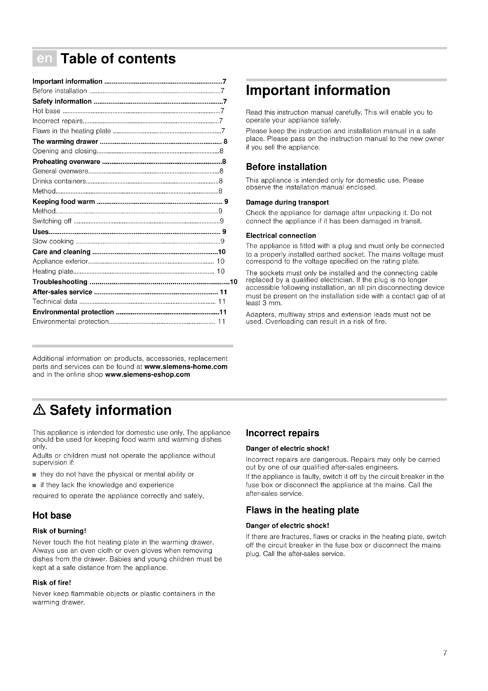- Environmental protection Produktinfo Additional information on products, accessories, replacement parts and services can be found at www.siemens-home.com and in the online shop www.siemens-eshop.com Important information Read this instruction manual carefully. This will enable you to operate your appliance safely. Please keep the instruction and installation manual in a safe place. Please pass on the instruction manual to the new owner if you sell the appliance. Before installation This appliance is intended only for domestic use. Please observe the installation manual enclosed. Damage during transport Check the appliance for damage after unpacking it. Do not connect the appliance if it has been damaged in transit. Electrical connection The appliance is fitted with a plug and must only be connected to a properly installed earthed socket. The mains voltage must correspond to the voltage specified on the rating plate. The sockets must only be installed and the connecting cable replaced by a qualified electrician. If the plug is no longer accessible following installation, an all pin disconnecting device must be present on the installation side with a contact gap of at least 3 mm. Adapters, multiway strips and extension leads must not be used. Overloading can result in a risk of fire. ã=Safety information This appliance is intended for domestic use only. The appliance should be used for keeping food warm and warming dishes only. Adults or children must not operate the appliance without supervision if: ■ they do not have the physical or mental ability or ■ if they lack the knowledge and experience required to operate the appliance correctly and safely. Hot base Risk of burning! Never touch the hot heating plate in the warming drawer. Always use an oven cloth or oven gloves when removing dishes from the drawer. Babies and young children must be kept at a safe distance from the appliance. Risk of fire! Never keep flammable objects or plastic containers in the warming drawer. Incorrect repairs Danger of electric shock! Incorrect repairs are dangerous. Repairs may only be carried out by one of our qualified after-sales engineers. If the appliance is faulty, switch it off by the circuit breaker in the fuse box or disconnect the appliance at the mains. Call the after-sales service. Flaws in the heating plate Danger of electric shock! If there are fractures, flaws or cracks in the heating plate, switch off the circuit breaker in the fuse box or disconnect the mains plug. Call the after-sales service.8 The warming drawer You can use the warming drawer to preheat ovenware or to keep food warm. The appliance will only heat up if the drawer is closed correctly. Opening and closing For appliances with no handle: Press the middle of the drawer to open or close it. When opening, the drawer pops out slightly. You can then pull it out towards you. Preheating ovenware Food stays warm for longer in preheated ovenware. Drinks also remain warm for longer. General ovenware Only load the warming drawer up to 25 kg. You can preheat dinnerware for 6 or 12 people, for example. Arranging ovenware As far as possible, distribute the ovenware over the entire surface. It takes longer to warm through tall stacks of plates than individual pieces of ovenware, e.g. 2 serving dishes. Drinks containers Always heat drinks containers, e.g. espresso cups, using setting 2. ã=Risk of burning! At setting 3 or 4, the drinks containers will get very hot. Method 1.Place the ovenware in the drawer.2.Set the function selector to setting 4. Always heat drinks containers using setting 2. The "power on" indicator light flashes. 3.Close the warming drawer. The "power on" indicator light lights up. The appliance heats up. How long does preheating take The length of time required for preheating depends on the material the ovenware is made of and its thickness, as well as the quantity, height and arrangement of the ovenware. As far as possible, distribute the ovenware over the entire surface. It takes approximately 15-25 minutes to preheat dinnerware for 6 people. Switching off Open the drawer. Switch off the function selector. Removing ovenware Remove ovenware from the drawer using oven gloves or an oven cloth. ã=Risk of burning! The upper surface of the heating plate will be hot. The base of the ovenware will be hotter than the top. 3RZHURQLQGLFDWRUOLJKW 7KHLQGLFDWRUOLJKWIODVKHVZKHQ \RXVZLWFKRQWKHDSSOLDQFH ,WOLJKWVXSZKHQWKHGUDZHU LVFORVHG )DQDQGKHDWHU UXQZKHQWKHSUHKHDW RYHQZDUHVHWWLQJLVVHOHFWHG +HDWLQJSODWH )XQFLRQVHOHFWRU 2II p. 11