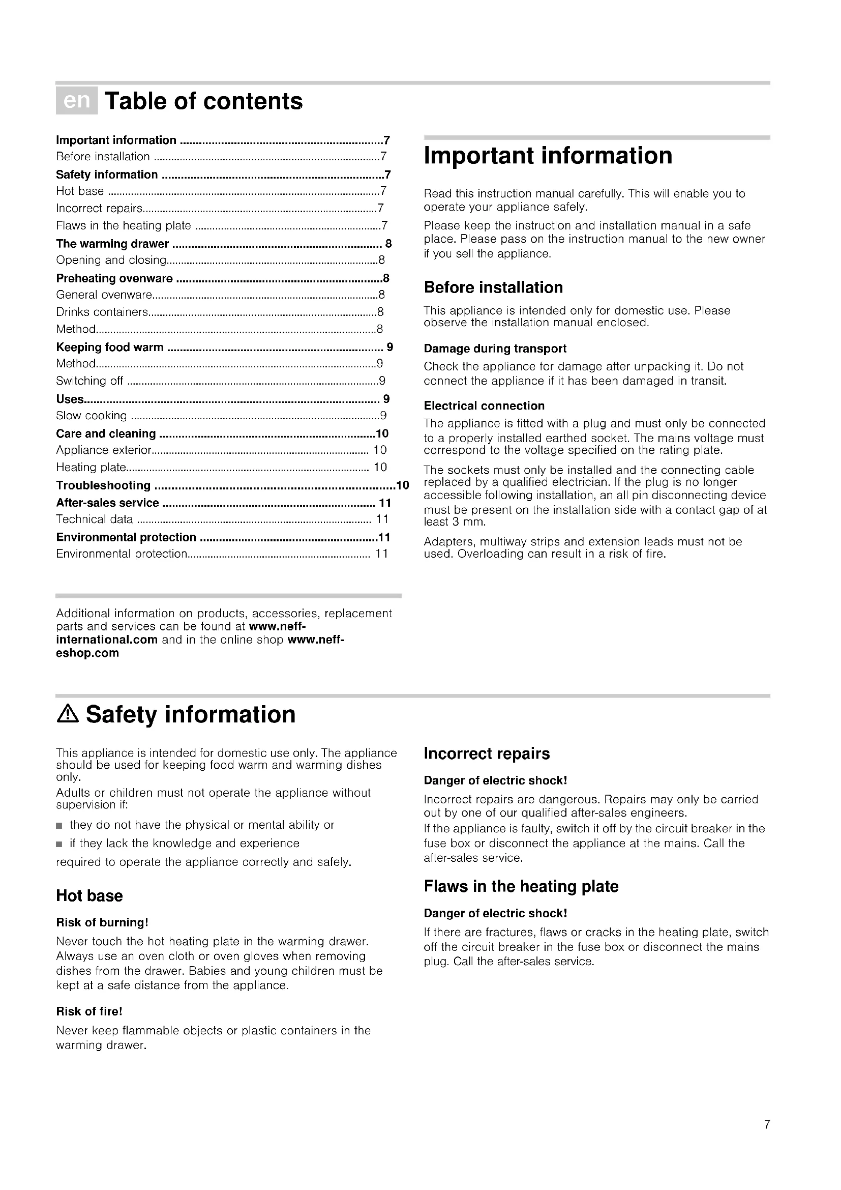 - Environmental protection Produktinfo Additional information on products, accessories, replacement parts and services can be found at www.neff- international.com and in the online shop www.neff- eshop.com Important information Read this instruction manual carefully. This will enable you to operate your appliance safely. Please keep the instruction and installation manual in a safe place. Please pass on the instruction manual to the new owner if you sell the appliance. Before installation This appliance is intended only for domestic use. Please observe the installation manual enclosed. Damage during transport Check the appliance for damage after unpacking it. Do not connect the appliance if it has been damaged in transit. Electrical connection The appliance is fitted with a plug and must only be connected to a properly installed earthed socket. The mains voltage must correspond to the voltage specified on the rating plate. The sockets must only be installed and the connecting cable replaced by a qualified electrician. If the plug is no longer accessible following installation, an all pin disconnecting device must be present on the installation side with a contact gap of at least 3 mm. Adapters, multiway strips and extension leads must not be used. Overloading can result in a risk of fire. ã=Safety information This appliance is intended for domestic use only. The appliance should be used for keeping food warm and warming dishes only. Adults or children must not operate the appliance without supervision if: ■ they do not have the physical or mental ability or ■ if they lack the knowledge and experience required to operate the appliance correctly and safely. Hot base Risk of burning! Never touch the hot heating plate in the warming drawer. Always use an oven cloth or oven gloves when removing dishes from the drawer. Babies and young children must be kept at a safe distance from the appliance. Risk of fire! Never keep flammable objects or plastic containers in the warming drawer. Incorrect repairs Danger of electric shock! Incorrect repairs are dangerous. Repairs may only be carried out by one of our qualified after-sales engineers. If the appliance is faulty, switch it off by the circuit breaker in the fuse box or disconnect the appliance at the mains. Call the after-sales service. Flaws in the heating plate Danger of electric shock! If there are fractures, flaws or cracks in the heating plate, switch off the circuit breaker in the fuse box or disconnect the mains plug. Call the after-sales service.8 The warming drawer You can use the warming drawer to preheat ovenware or to keep food warm. The appliance will only heat up if the drawer is closed correctly. Opening and closing For appliances with no handle: Press the middle of the drawer to open or close it. When opening, the drawer pops out slightly. You can then pull it out towards you. Preheating ovenware Food stays warm for longer in preheated ovenware. Drinks also remain warm for longer. General ovenware Only load the warming drawer up to 25 kg. You can preheat dinnerware for 6 or 12 people, for example. Arranging ovenware As far as possible, distribute the ovenware over the entire surface. It takes longer to warm through tall stacks of plates than individual pieces of ovenware, e.g. 2 serving dishes. Drinks containers Always heat drinks containers, e.g. espresso cups, using setting 2. ã=Risk of burning! At setting 3 or 4, the drinks containers will get very hot. Method 1.Place the ovenware in the drawer.2.Set the function selector to setting 4. Always heat drinks containers using setting 2. The "power on" indicator light flashes. 3.Close the warming drawer. The "power on" indicator light lights up. The appliance heats up. How long does preheating take The length of time required for preheating depends on the material the ovenware is made of and its thickness, as well as the quantity, height and arrangement of the ovenware. As far as possible, distribute the ovenware over the entire surface. It takes approximately 15-25 minutes to preheat dinnerware for 6 people. Switching off Open the drawer. Switch off the function selector. Removing ovenware Remove ovenware from the drawer using oven gloves or an oven cloth. ã=Risk of burning! The upper surface of the heating plate will be hot. The base of the ovenware will be hotter than the top. 3RZHURQLQGLFDWRUOLJKW 7KHLQGLFDWRUOLJKWIODVKHVZKHQ \RXVZLWFKRQWKHDSSOLDQFH ,WOLJKWVXSZKHQWKHGUDZHU LVFORVHG )DQDQGKHDWHU UXQZKHQWKHSUHKHDW RYHQZDUHVHWWLQJLVVHOHFWHG +HDWLQJSODWH )XQFLRQVHOHFWRU 2II p. 11