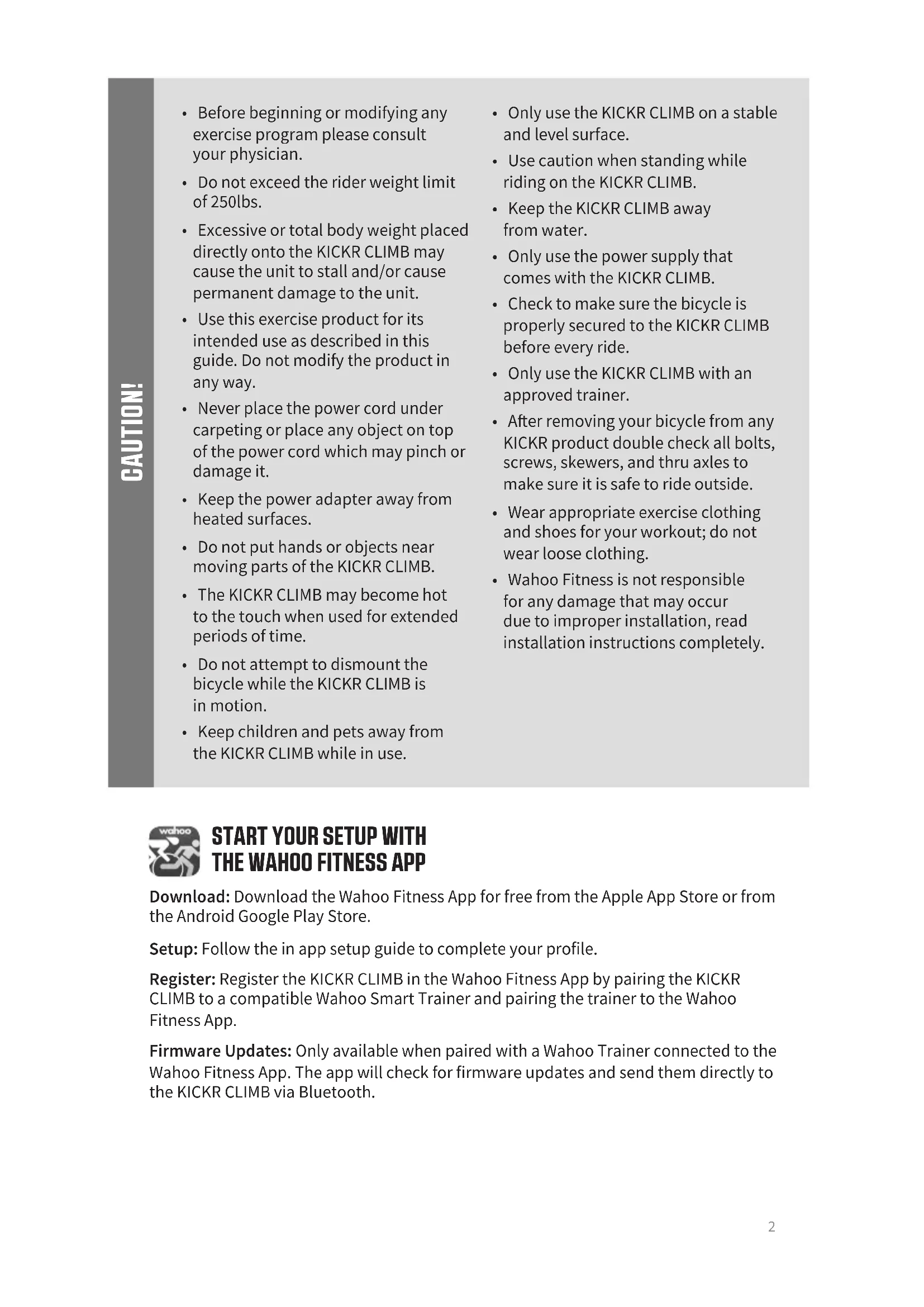 - Wahoo Fitness is not responsible for any damage that may occur due to improper installation, read installation instructions completely. CAUTION!