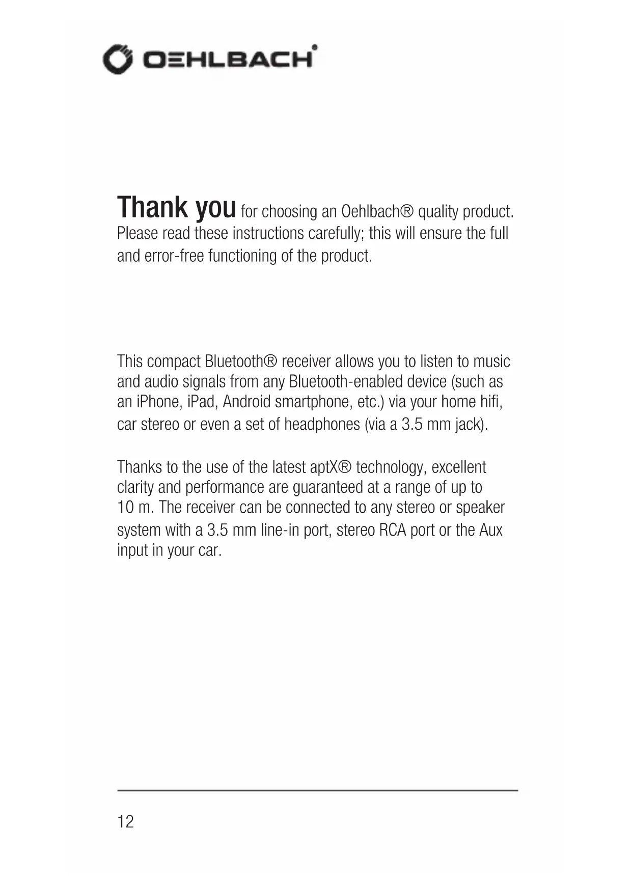 - Kostenerstattung bei Schadensbehebung durch Dritte ohne unser vorheriges Einverständnis.12 Thank you for choosing an Oehlbach® quality product. Please read these instructions carefully; this will ensure the full and error-free functioning of the product. This compact Bluetooth® receiver allows you to listen to music and audio signals from any Bluetooth-enabled device (such as an iPhone, iPad, Android smartphone, etc.) via your home hifi, car stereo or even a set of headphones (via a 3.5mm jack). Thanks to the use of the latest aptX® technology, excellent clarity and performance are guaranteed at a range of up to 10m. The receiver can be connected to any stereo or speaker system with a 3.5 mm line-in port, stereo RCA port or the Aux input in your car.13 ENG BTX 1000 Functions ∙ Audio streaming from any Bluetooth® device ∙ High quality Bluetooth audio with aptX® support ∙ 44.1kHz and 16bit (CD quality) audio formats supported ∙ Bluetooth 4.0 compatible ∙ Up to 10 hours of listening pleasure Specification Range: up to 10m Data rate: up to 352kbps Battery charge: up to 10 hours Frequency response: 10Hz to 22kHz Temperature range: -15 to +50 °C Permissible rel. humidity: 5 to 90% Dimensions (w x h x d): 28 x 16 x 78 mm Packaging contents ∙ Oehlbach Bluetooth audio receiver BTX1000 ∙ USB-A to USB micro cable ∙ 3.5 mm to stereo RCA adapter ∙ Operating instructions14 Operation Pairing with Bluetooth devices: