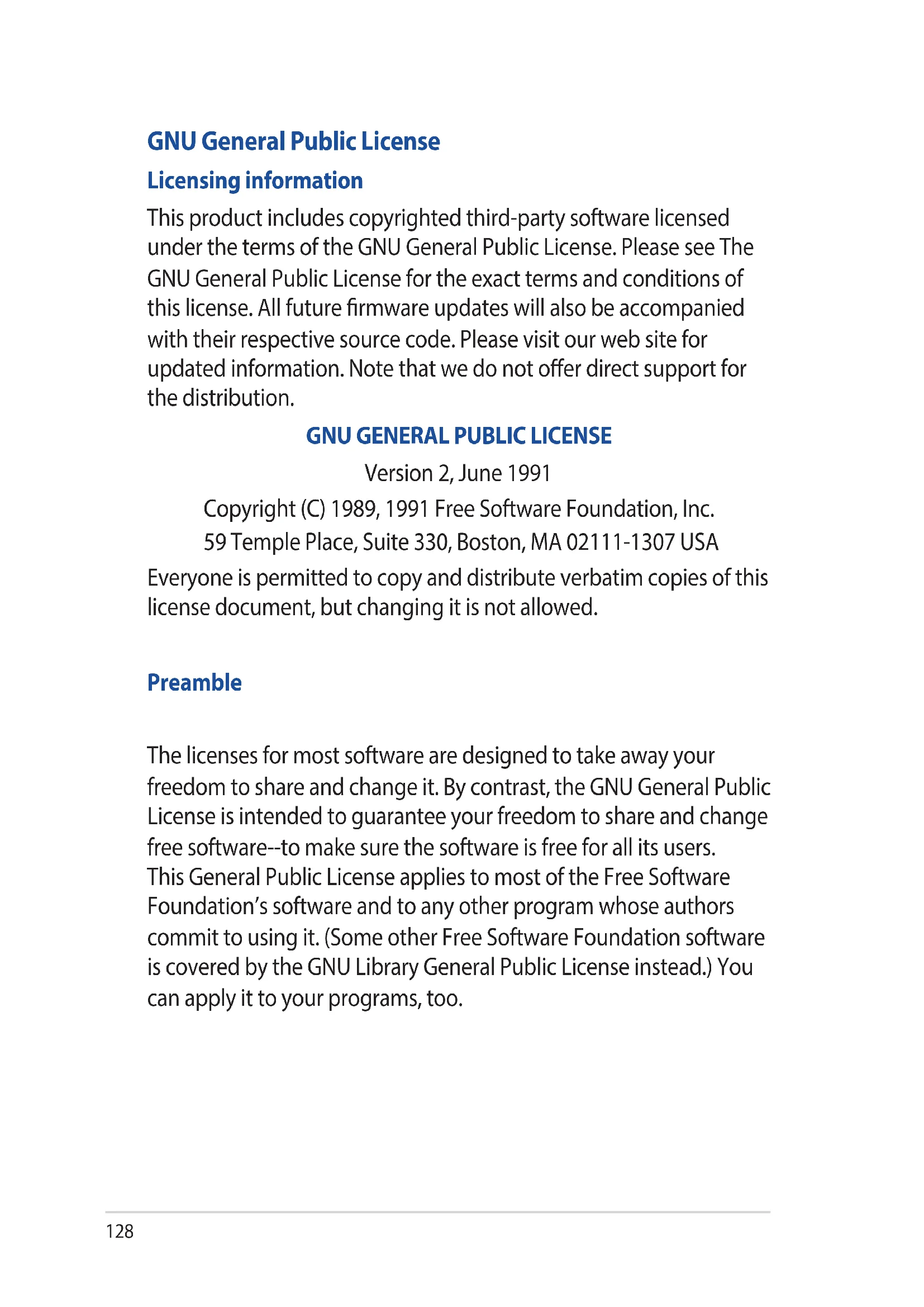 GNU General Public License Licensing information This product includes copyrighted third-party software licensed under the terms of the GNU General Public License. Please see The GNU General Public License for the exact terms and conditions of this license. All future rmware updates will also be accompanied with their respective source code. Please visit our web site for updated information. Note that we do not oer direct support for the distribution.