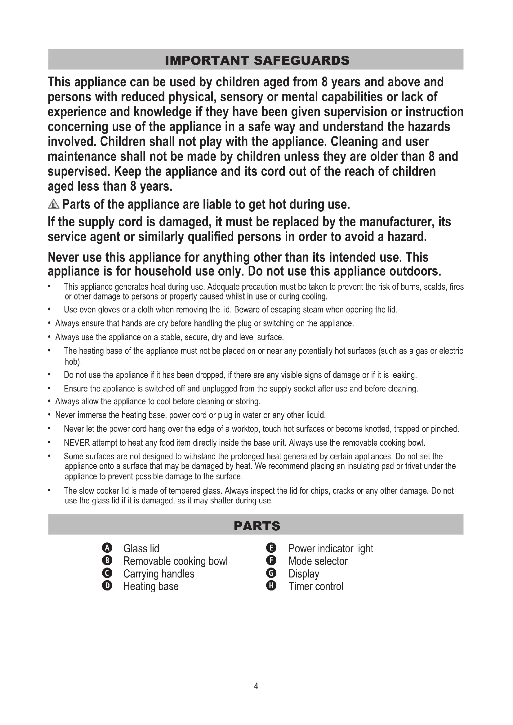 - The slow cooker lid is made of tempered glass. Always inspect the lid for chips, cracks or any other damage. Do not use the glass lid if it is damaged, as it may shatter during use. PARTS