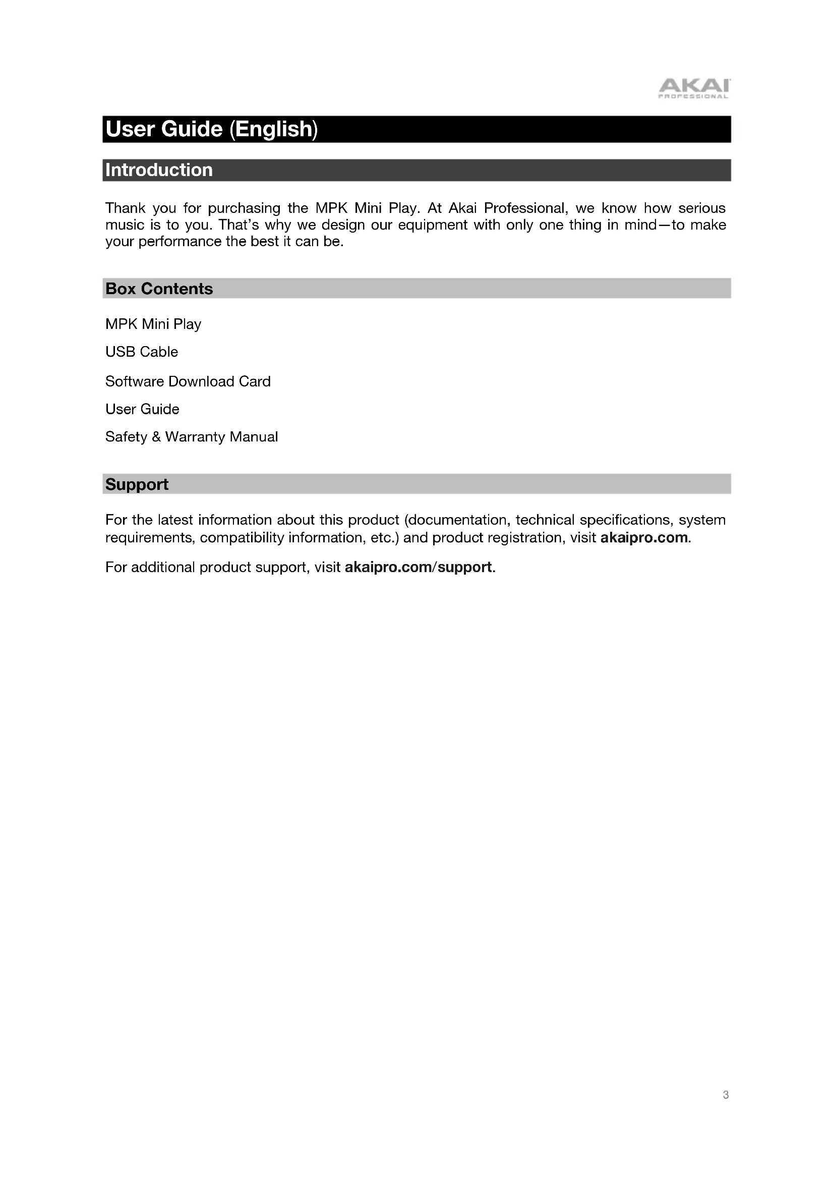 User Guide English ( 3 – 7 ) Guía del usuario Español ( 8 – 12 ) Guide d’utilisation Français ( 13 – 17 ) Guida per l’uso Italiano ( 18 – 23 ) Benutzerhandbuch Deutsch ( 24 – 29 ) Appendix English ( 30 ) MPK Mini Play23 User Guide (English) Introduction Thank you for purchasing the MPK Mini Play. At Akai Professional, we know how serious music is to you. That’s why we design our equipment with only one thing in mind—to make your performance the best it can be. Box Contents MPK Mini Play USB Cable Software Download Card User Guide Safety & Warranty Manual Support For the latest information about this product (documentation, technical specifications, system requirements, compatibility information, etc.) and product registration, visit akaipro.com. For additional product support, visit akaipro.com/support.4 Quick Start Playing Sounds Note: To play internal sounds, the Internal Sounds button must be engaged. To access the Drum sounds: There are 10 drum kits available. Press the Drums button and rotate the encoder to select a drum kit. Tap the pads to trigger the drum kit sounds. To access the Keyboard sounds: There are 128 Keys programs available. Press the Keys button and rotate the encoder to select a Keys program. The Keys programs are played with the 25 keys. Accessing the Favorites: A Favorite consists of a Keys patch, a Drums patch, and your effects knobs settings. To access a Favorite, press the Favorites button then tap one of the pads to call up that Favorite. Saving a Favorite: You can store up to eight Favorites with MPK Mini Play. To do this, press the Favorites + Internal Sounds buttons, then tap one of the eight pads to store your Favorite to that location.