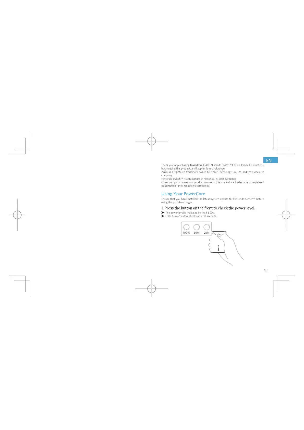 Thank you for purchasing PowerCore 13400 Nintendo Switch™ Edition. Read all instructions before using this product, and keep for future reference. Anker is a registered trademark owned by Anker Technology Co., Ltd. and the associated company. Nintendo Switch