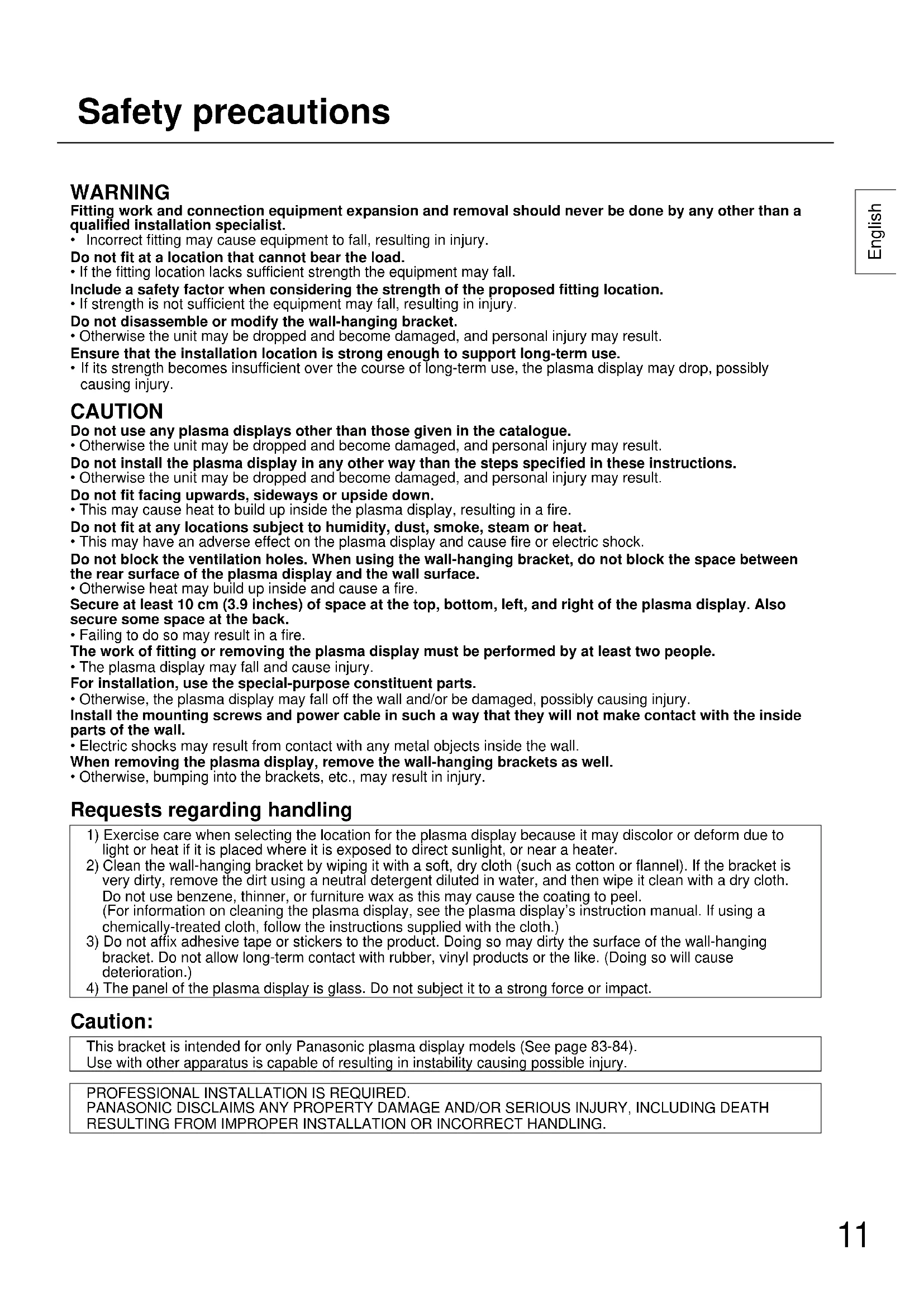 Caution: This bracket is intended for only Panasonic plasma display models (See page 83-84). Use with other apparatus is capable of resulting in instability causing possible injury. PROFESSIONAL INSTALLATION IS REQUIRED. PANASONIC DISCLAIMS ANY PROPERTY DAMAGE AND/OR SERIOUS INJURY, INCLUDING DEATH RESULTING FROM IMPROPER INSTALLATION OR INCORRECT HANDLING.12 English Components Precautions for wall-hanging bracket fitting ♦ The wall-hanging bracket is for use in attaching a plasma display unit to a vertical wall for viewing. Do not fit to any surface other than a vertical wall. ♦ To ensure correct plasma display performance and prevent trouble, do not fit at any of the following locations.